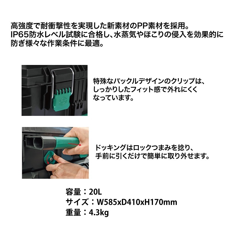 ■商品説明 | 高強度で耐衝撃性を実現した新素材のPP素材を採用 IP65防水レベル試験に合格し、水蒸気やほこりの侵入を効果的に防ぎ様々な作業条件に最適 スタッキングボックスを組み合わせれば、1つのキャリーボックスとして使用できます。 特殊なバックルデザインのクリップは、しっかりしたフィット感で外れにくくなっています。 9インチの大型キャスターで悪路でも簡単に移動可能です。 ドッキングはロックつまみを捻り、手前に引くだけで簡単に取り外せます。 サイズ:L585×W410×H170mm 重量:4.3kg |