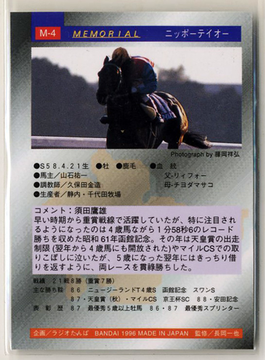 | ★ニッポーテイオー M4 メモリアルカード バンダイ サラブレッドカード 96年上半期版 郷原洋行 天皇賞(秋) マイルCS 安田記念 写真 画像 競馬カード 即決 | |