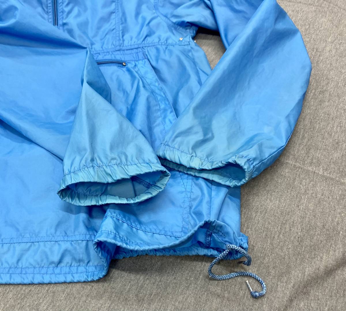 裾、襟に紐のアジャスター、両サイドにポケット、お腹部分にポケット、