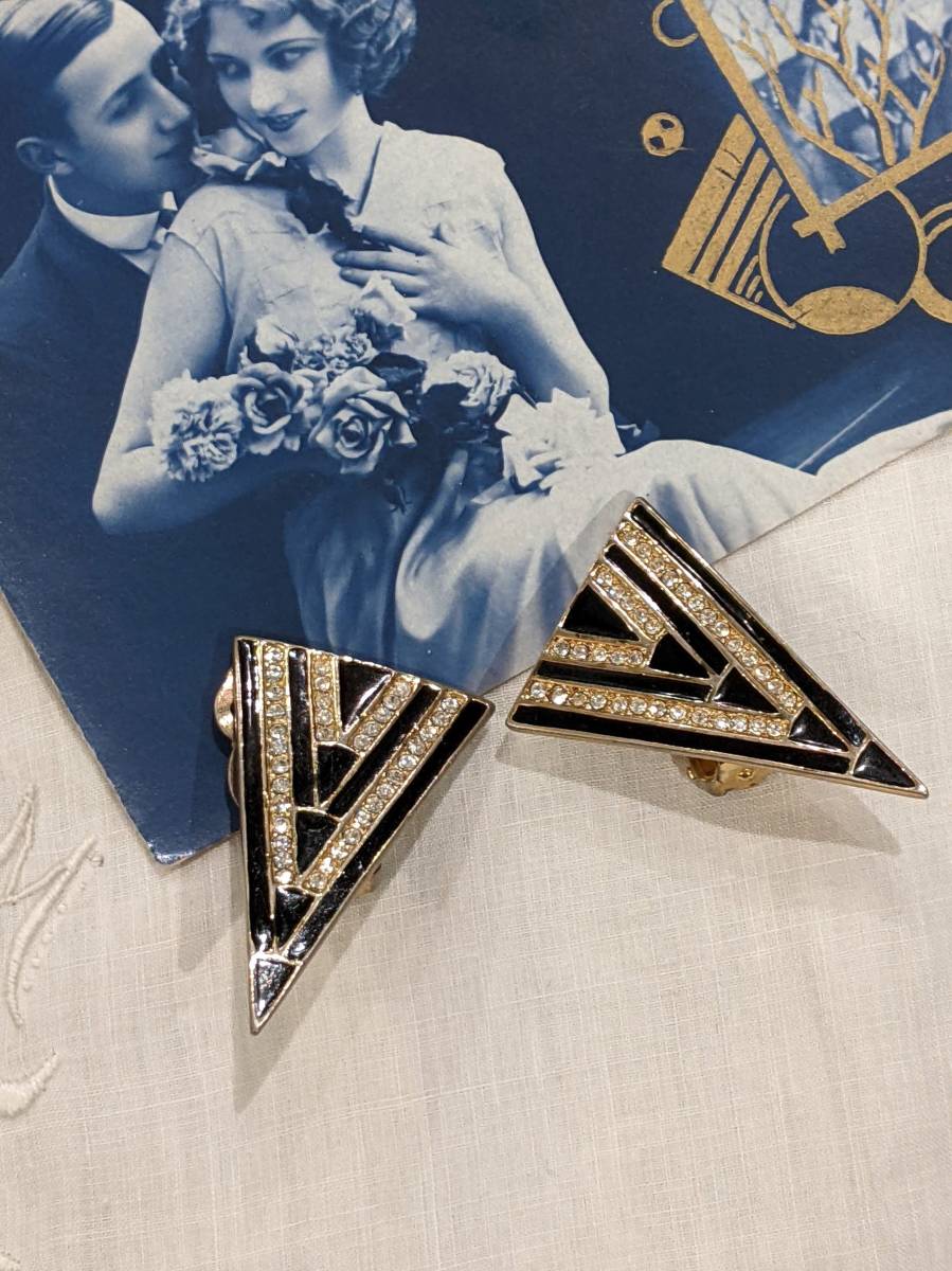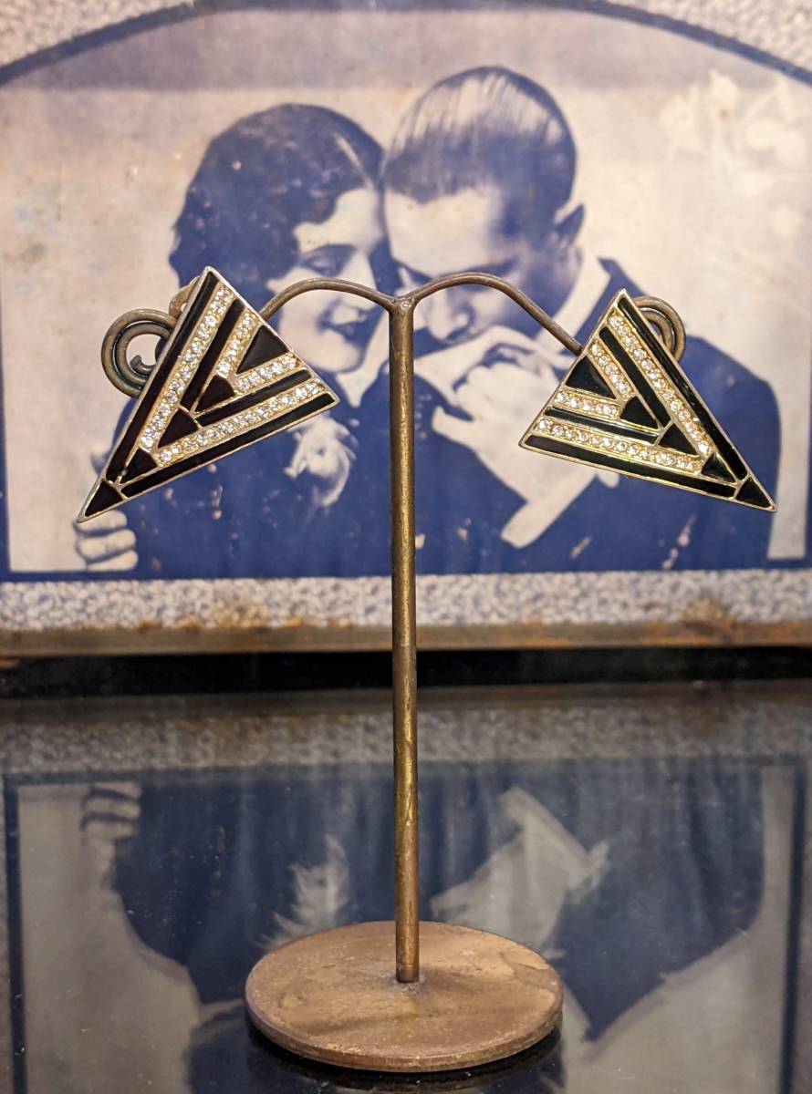 フランスヴィンテージ70’s80’sアールデコ風イヤリング/20’sスタイルヨーロッパアンティークエナメルラインストーンジュエリーΓOT