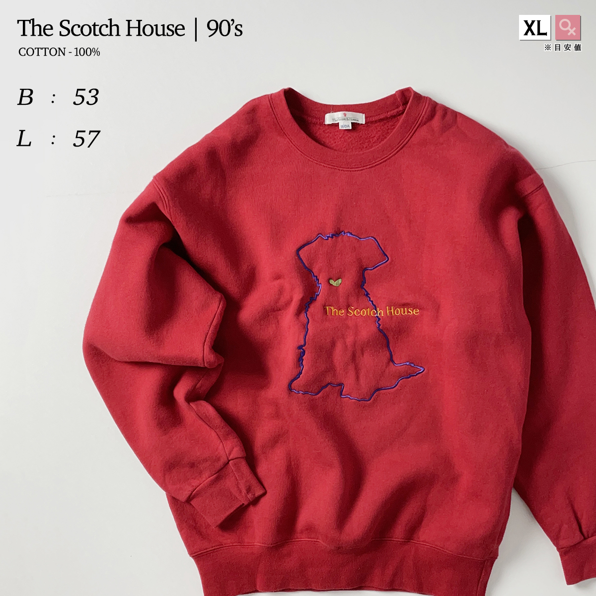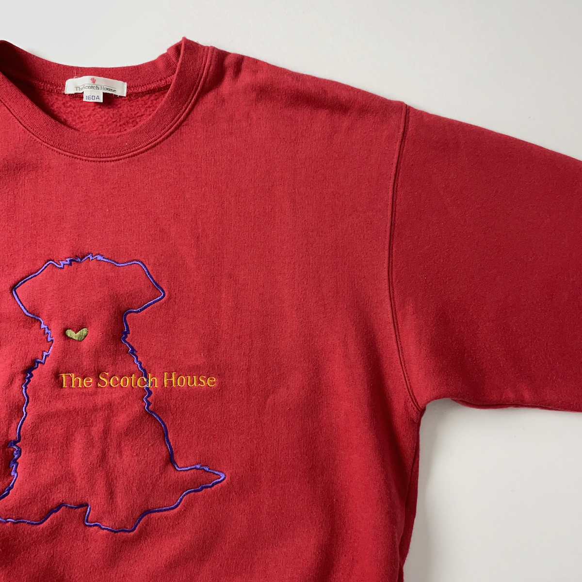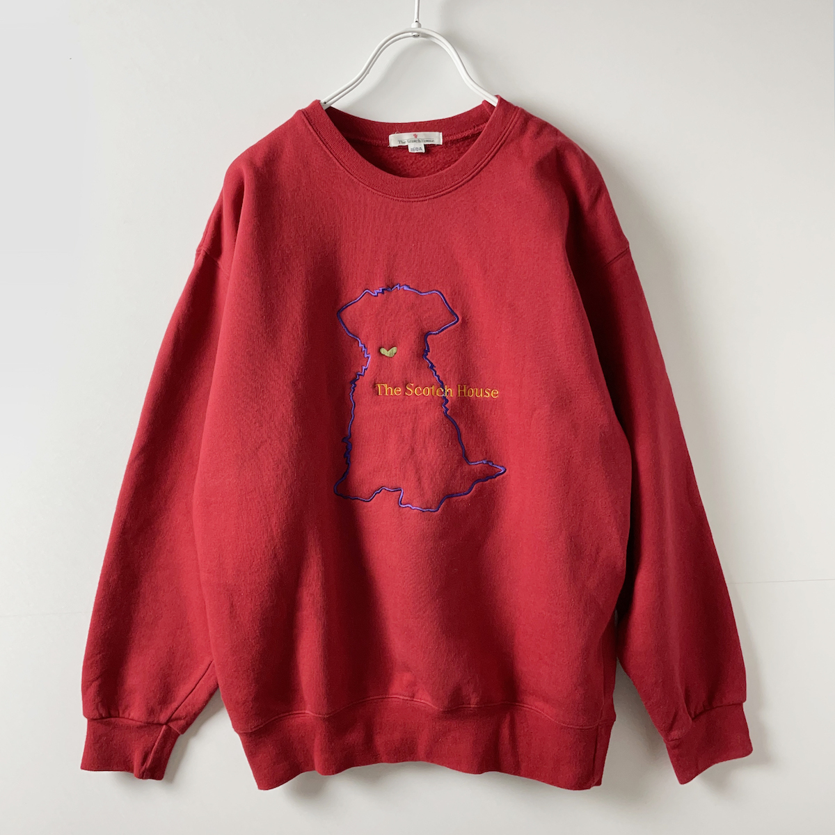 ザ・スコッチハウス 90s ヴィンテージ 裏起毛 オーバーサイズ 厚手 スウェット 綿 100% 赤 レッド 犬 刺繍 アニマル 160 13号 大きいサイズ