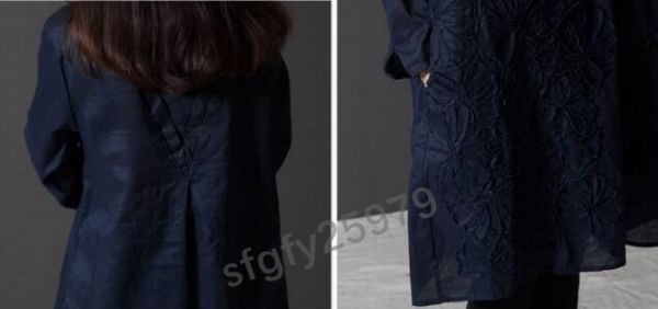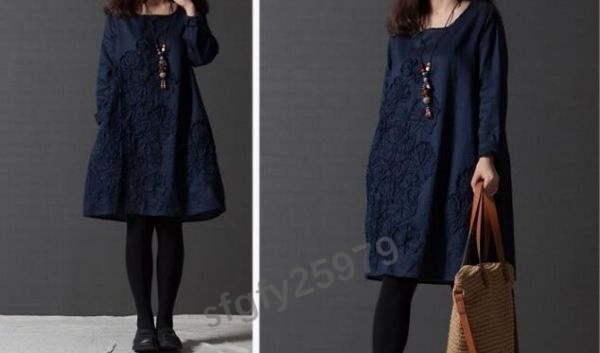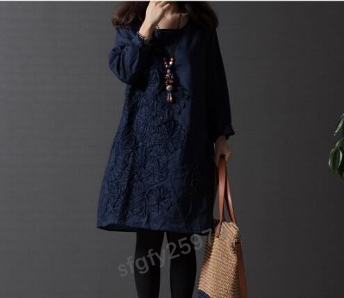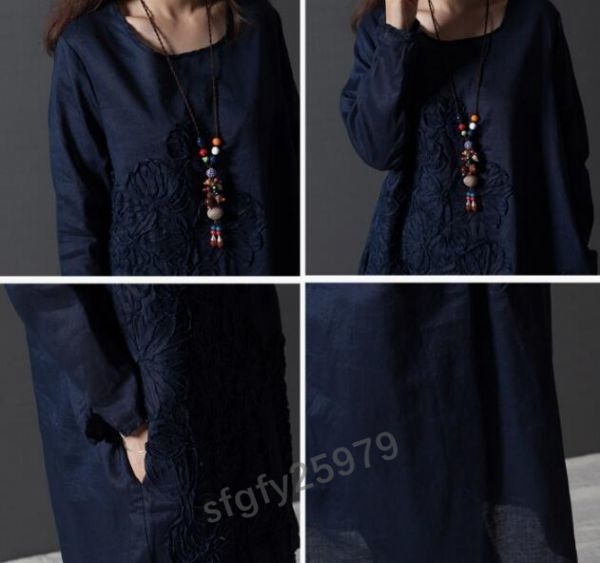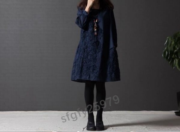 J018☆新品人気**レディースワンピース 春 体型カバー お花刺繍 コットンリネン 大きいサイズ 長袖 チュニックワンピース 紺 S~XXL
