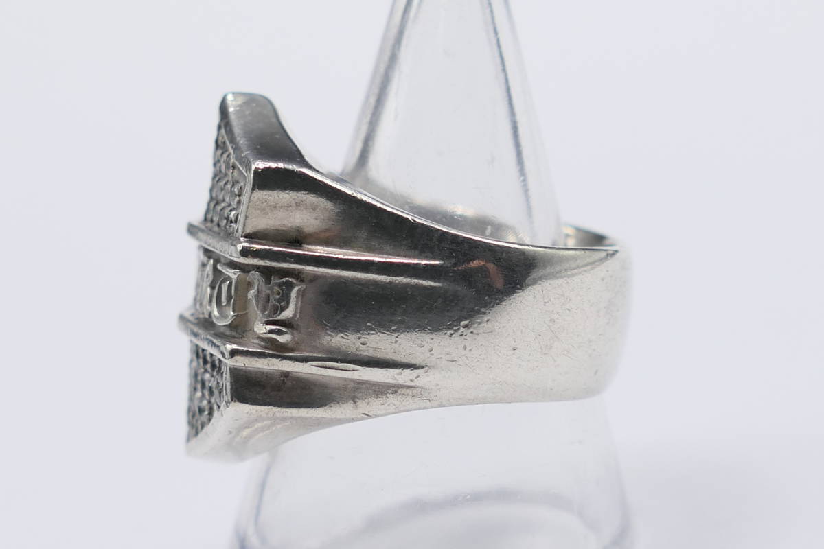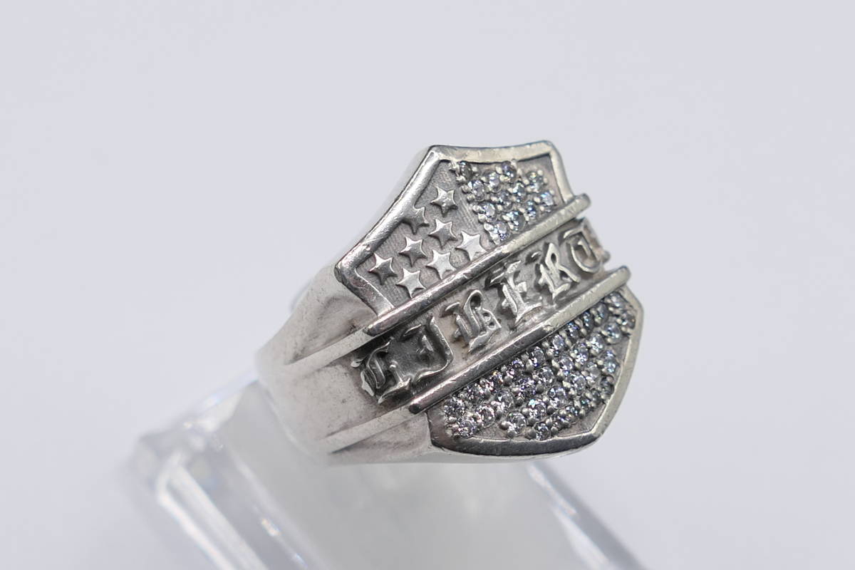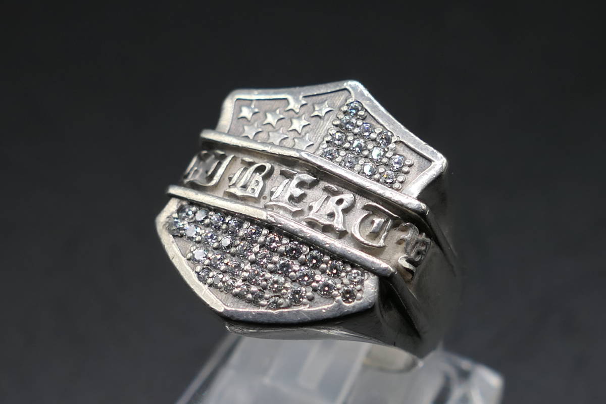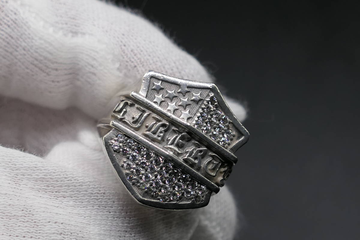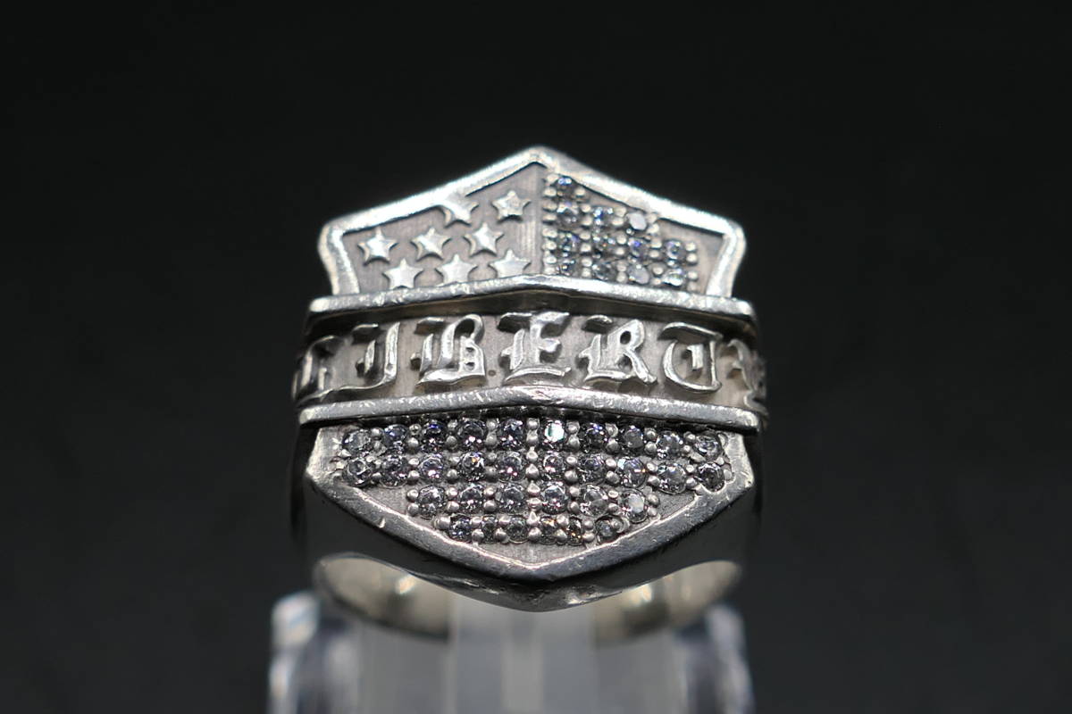 シールド型のリングにスターモチーフと文字を彫り込み、ジルコニアを散りばめました。