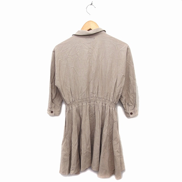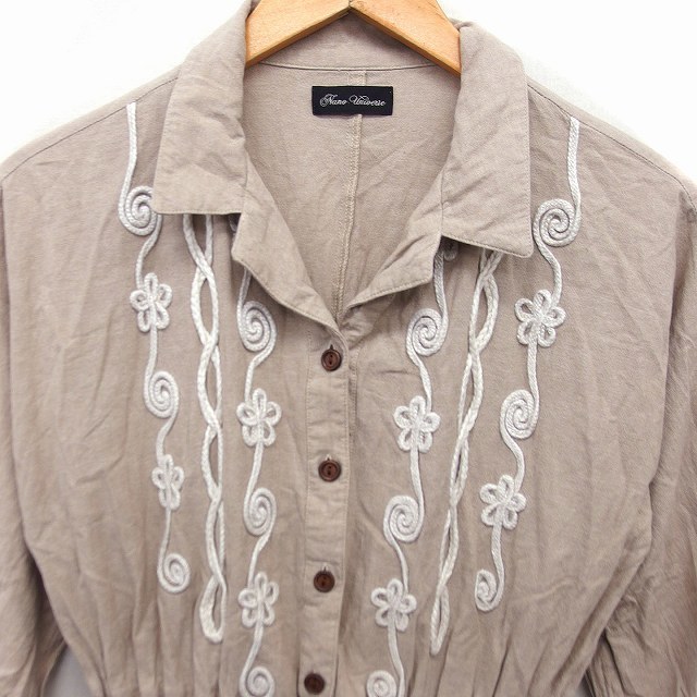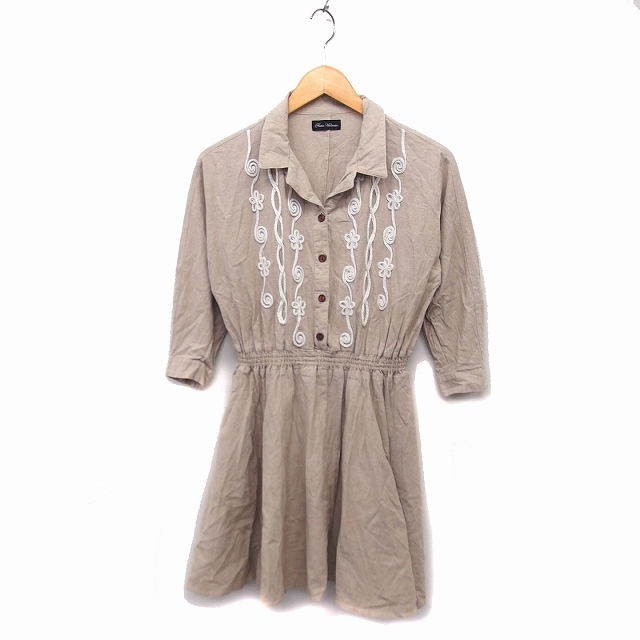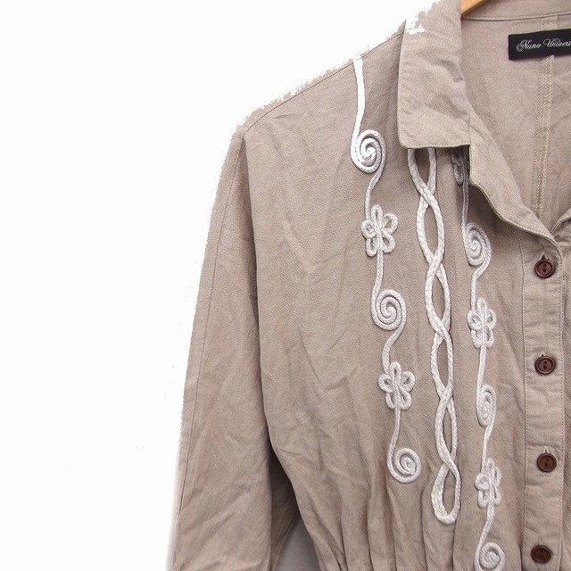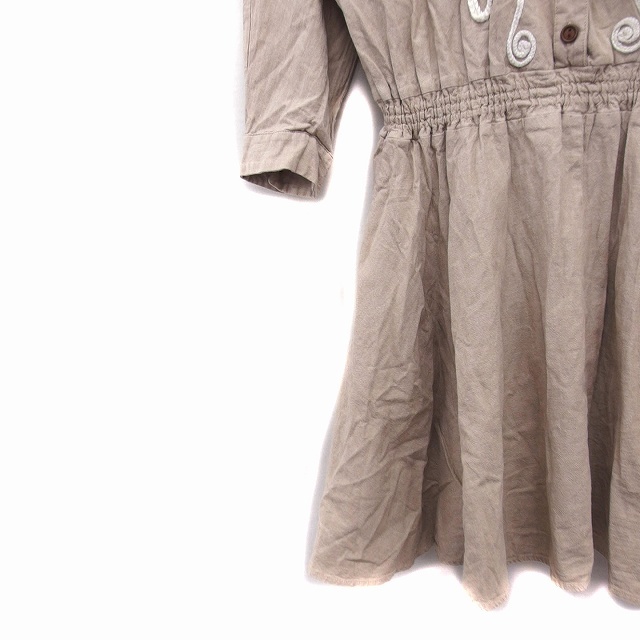 ナノユニバース nano universe フレア ワンピース ロープ刺繍 七分袖 ミニ 綿 ベージュ /FT33