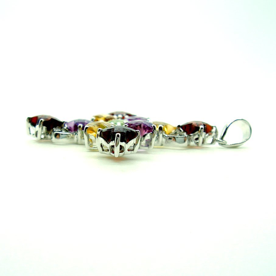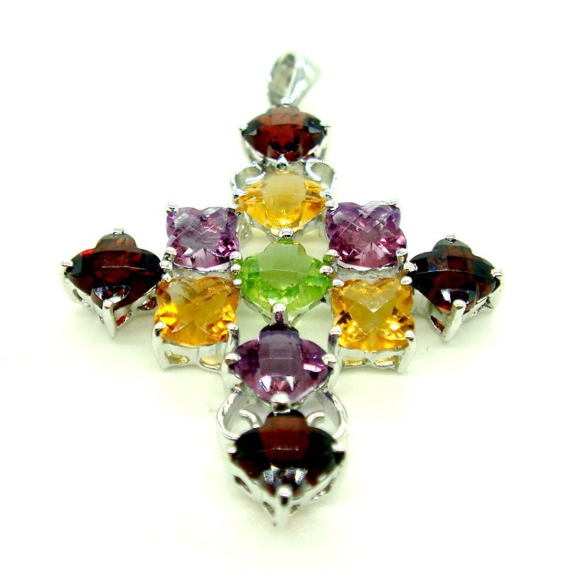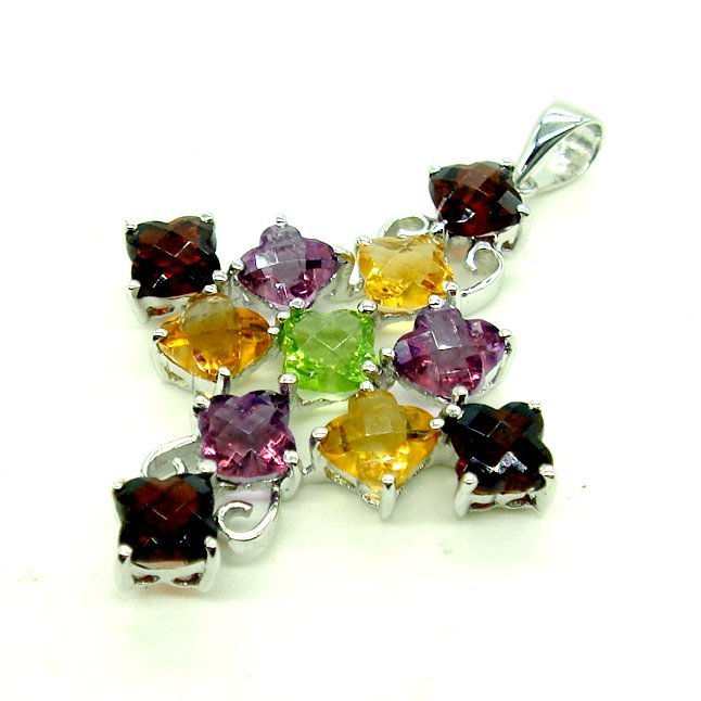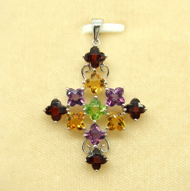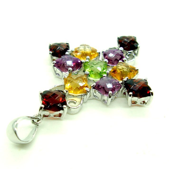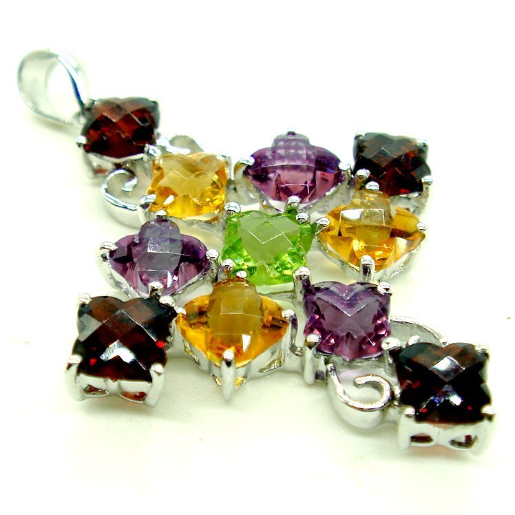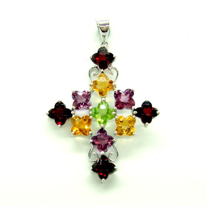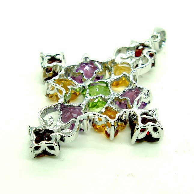 紫(アメジスト)・黄(シトリン)・エンジ(ガーネット)の3色がセンターの緑(ペリドット)取り巻く様に配置されています。