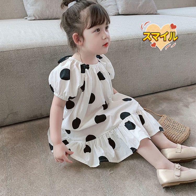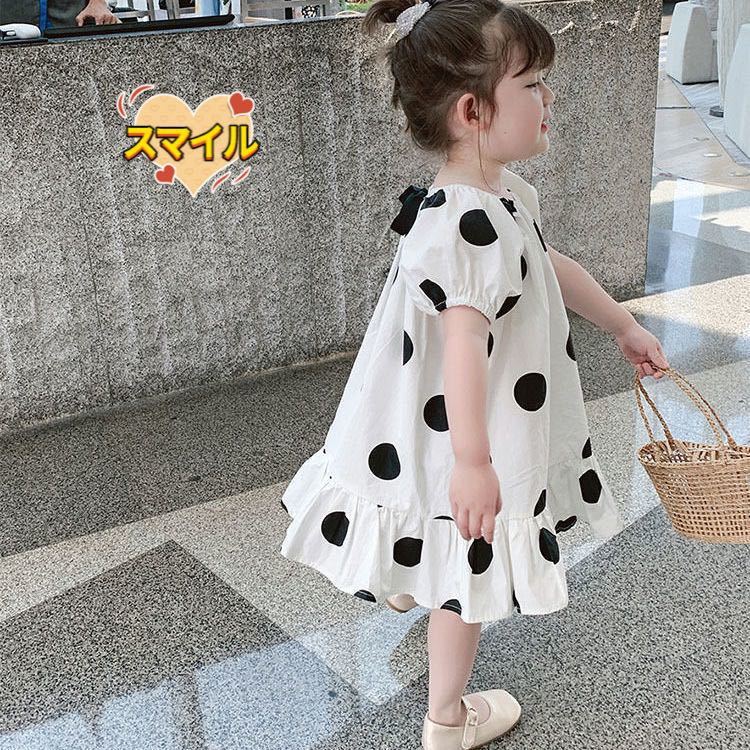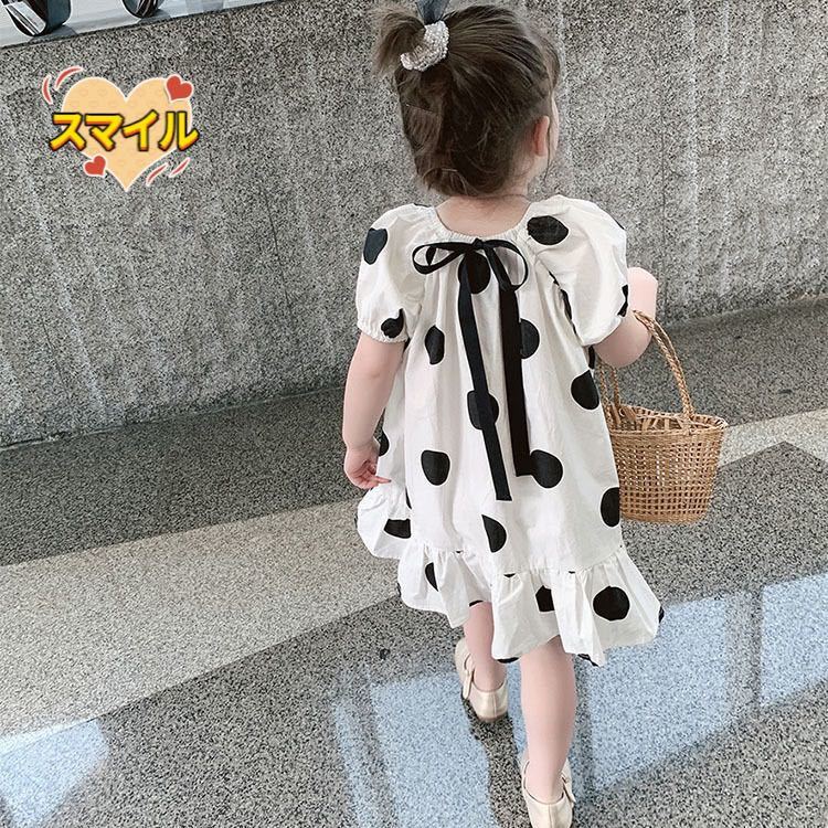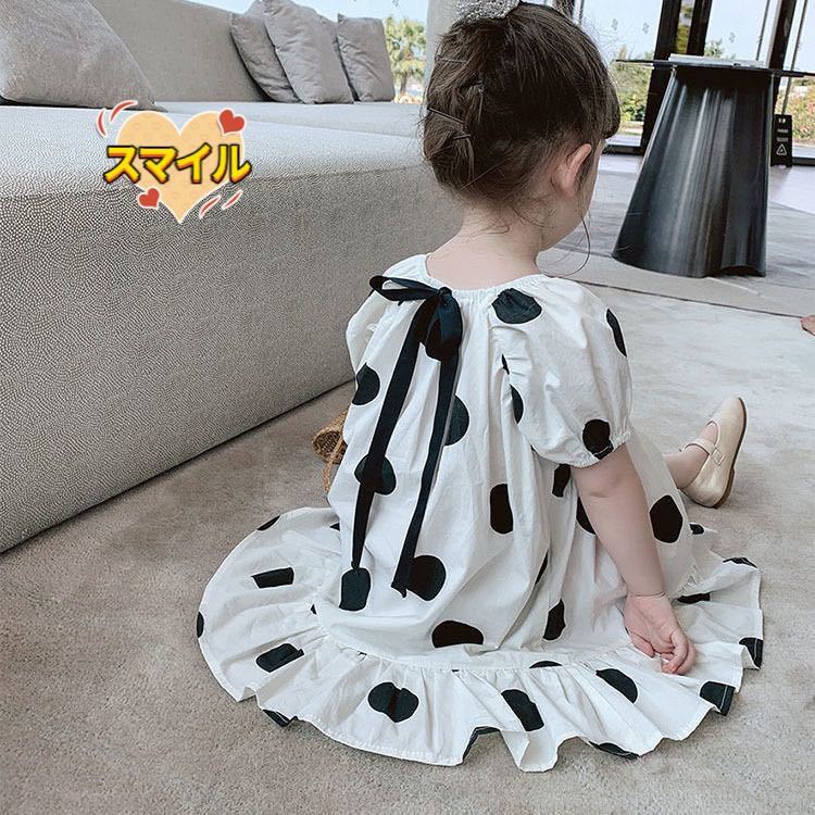 後ろにリボンあり可愛いドットワンピースになります 袖口はゴム仕様で女の子らしいふんわり袖にとてもおしゃれです