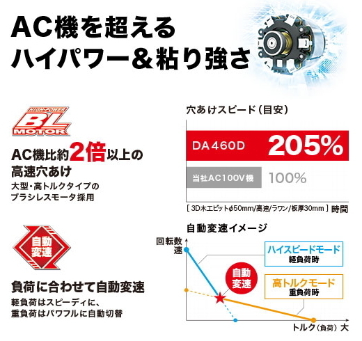 AC機比約2倍以上の高速穴あけ 大型・高トルクタイプのブラシレスモータ採用