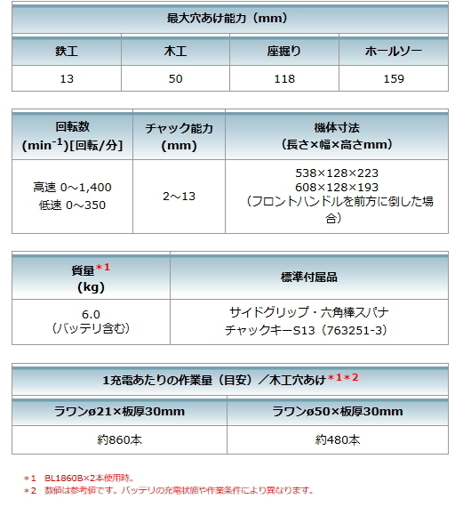 最大穴あけ能力 鉄工13mm 木工50mm 座掘り118mm ホルソー159mm
