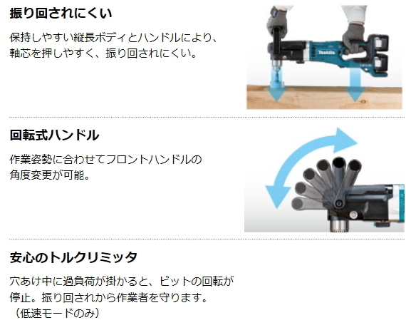 穴あけ中に過負荷が掛かると、ビットの回転が停止。振り回されから作業者を守ります。(低速モードのみ)