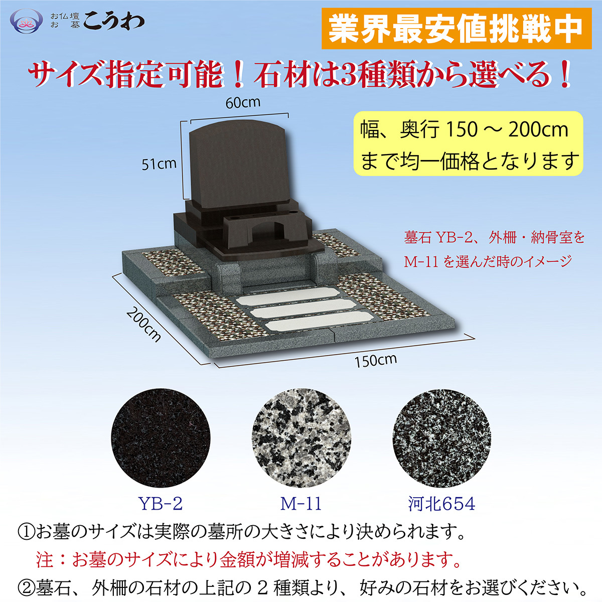 墓石対応サイズ:幅150200cm×奥行150200cm(石材原産国:中国)/4㎡まで同じ価格で対応いたします