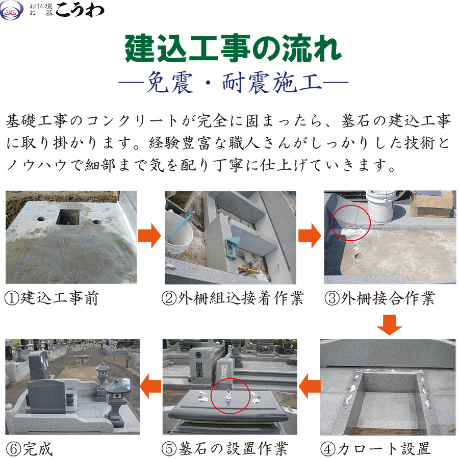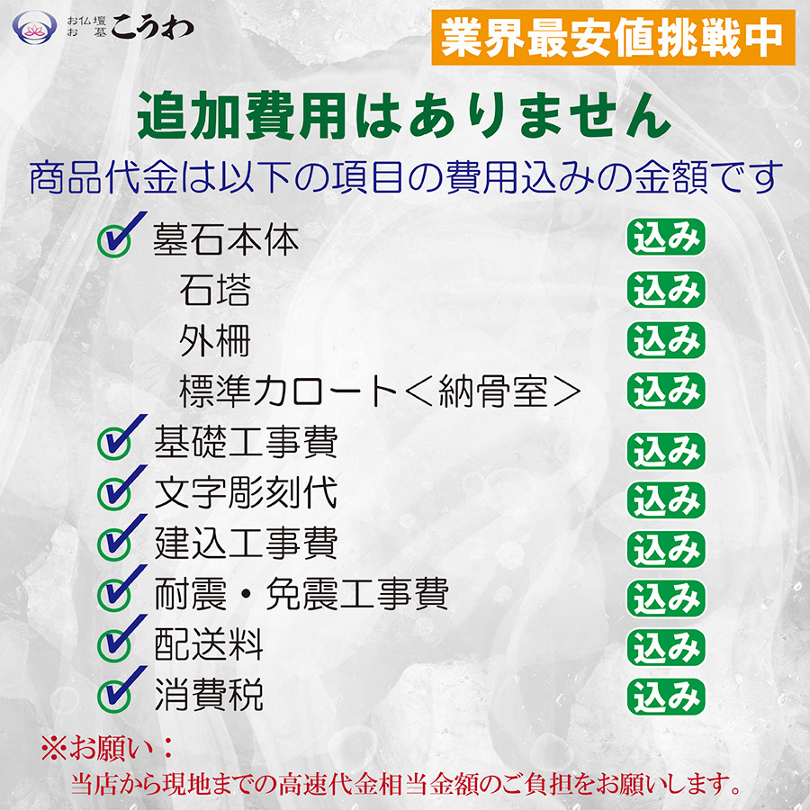 セット内容:墓石(石塔、外柵等)、文字彫刻、設置費、免震・耐震工事費、配送料
