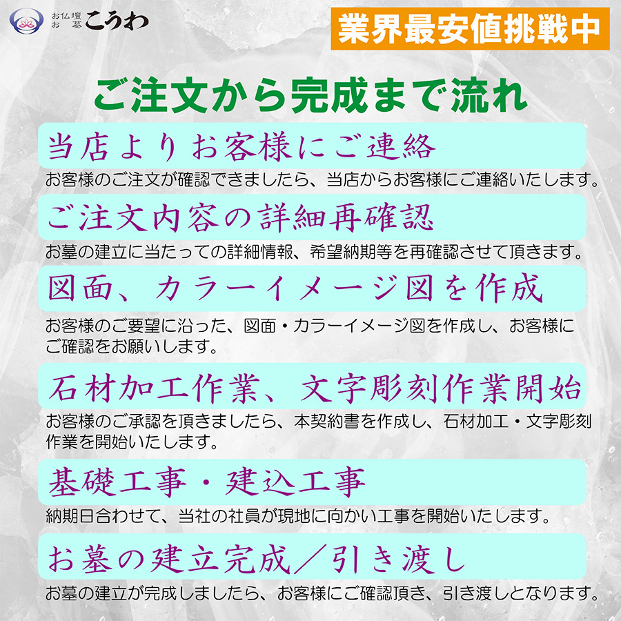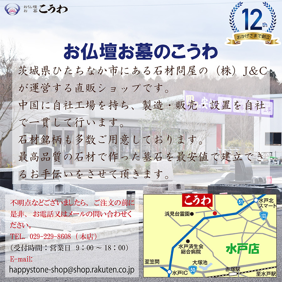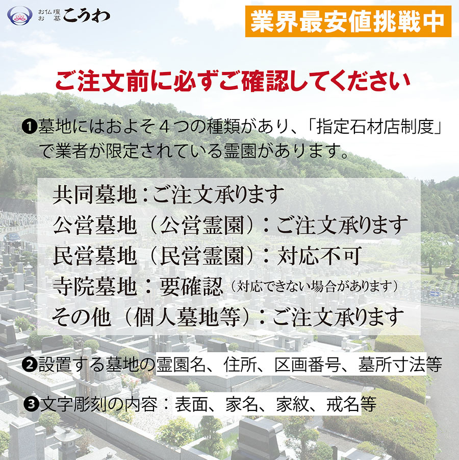 〇背の低い洋型墓石です。手入れが楽で、容易に綺麗さを保つことができます。お子様でも水をかけてお参りできます。 〇ご注文前に必ずご確認をお願いします。墓地には「指定石材制度」により業者が限定されている霊園があります。共同墓地・公営墓地(公営霊園)・その他(個人墓地)等はご注文承ります。寺院墓地は対応できない場合がありますので、ご注文前に必ず寺院にご確認ください。民営墓地(民営霊園)は対応できかねますのでご了承ください。 〇4種類の石材をご用意しております。ご希望の石材をお選びください。(石塔:YB-2、河北654/外柵等:河北654M-11) 〇ご注意:工事が困難な場所、危険を伴う現地又は標準工事以外の作業を伴う場合は別途追加費用を請求させていただきます。下記の項目に当てはまると追加費用が発生する場合があります。霊園に駐車場が無い。霊園に水場が無い。霊園の道幅が狭い(1m以下)山の上で工事する必要がある。 〇ご注文から完成までの流れお客様のご注文が確認できましたら、当店からお客様にご連絡いたします。お墓の建立に当たっての詳細情報を再確認させて頂きます。お客様のご要望に沿った図面・カラーイメージ図を作成し、お客様にご確認をお願いします。お客様のご承認を頂きましたら、石材加工・文字彫刻作業を開始致します。納期日に合わせて、当社の社員が現地に向かい工事を開始いたします。お墓の建立が完成しましたら、お客様にご確認を頂き、引き渡しとなります。 〇高速料金について。当店から現地までの高速代金相当金額のご負担をお願いします。霊園のご住所等の詳細情報を頂いた後に、ご負担いただく高速代金をご提示させて頂きます。 〇以下の場合は保証期間であっても有料修理となります墓地管理者の不十分による事故、墓地造成上の欠陥、いたずら、盗難地震、風水害などの天変地異、公害などによる破損、損傷、変質石塔の部分と外柵の部分のお好きな石材を、それぞれお選びください。霊園及び墓地の場所によっては施工できない場合ありますので、墓石に関しましては、 いきなりのご注文はお断りいたします。連絡なしのご注文されても受付承諾できません。 *注文する前に必ずメールjandcinfo@yahoo.co.jpもしくはお電話029-291-5895にてお問い合わせください。 お支払いに関しては、お墓が完成してからでも良いです。 *取引の流れといたしまして、まず建てる所がわかりますように地図 写真等、そして彫入れる文字等の原稿を お知らせください。見本作成して送りいたします。 【ご注意】北海道、沖縄、及び離島は経費が掛かりすぎますので施工不可能です。 まずは、お電話またはメールにてお問い合わせください。