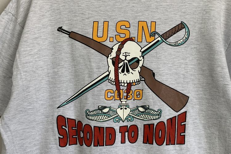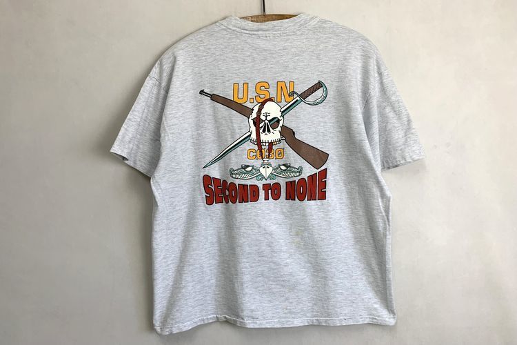 90sビンテージUSA製HanesヘインズU.S.NネイビーC030SecondToNoneスカルヘッドプリントTシャツL霜降りグレーアメカジミリタリーnr23751
