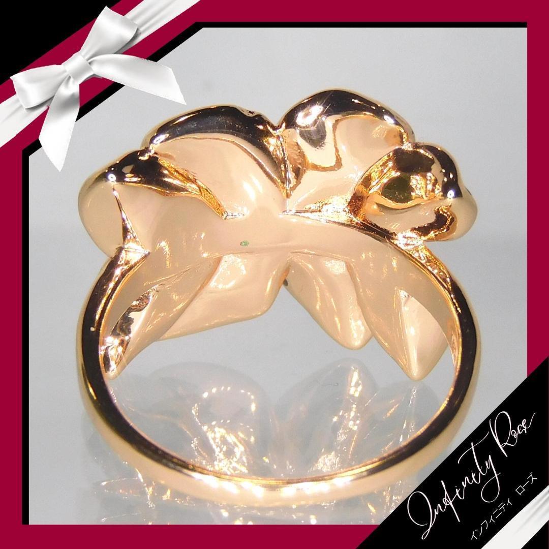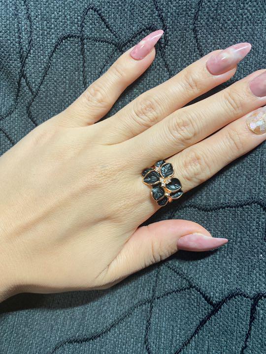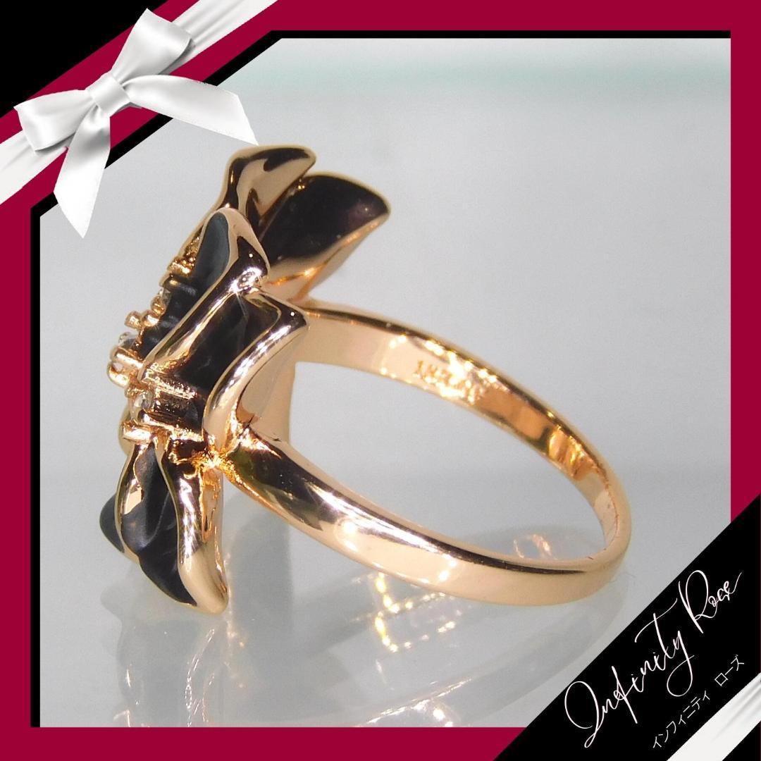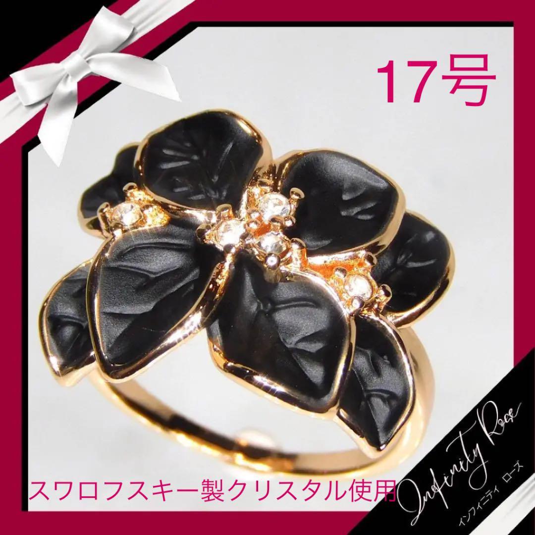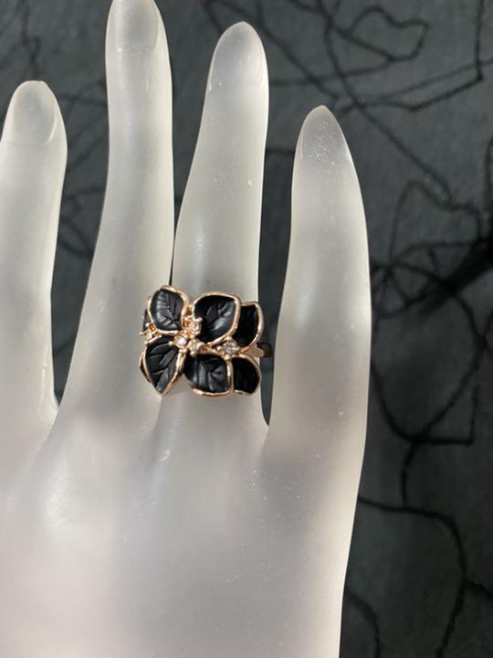 (1105)17号 ピンクゴールド ブラックフラワー 高級 大きめお花のリング スワロフスキー製クリスタル使用