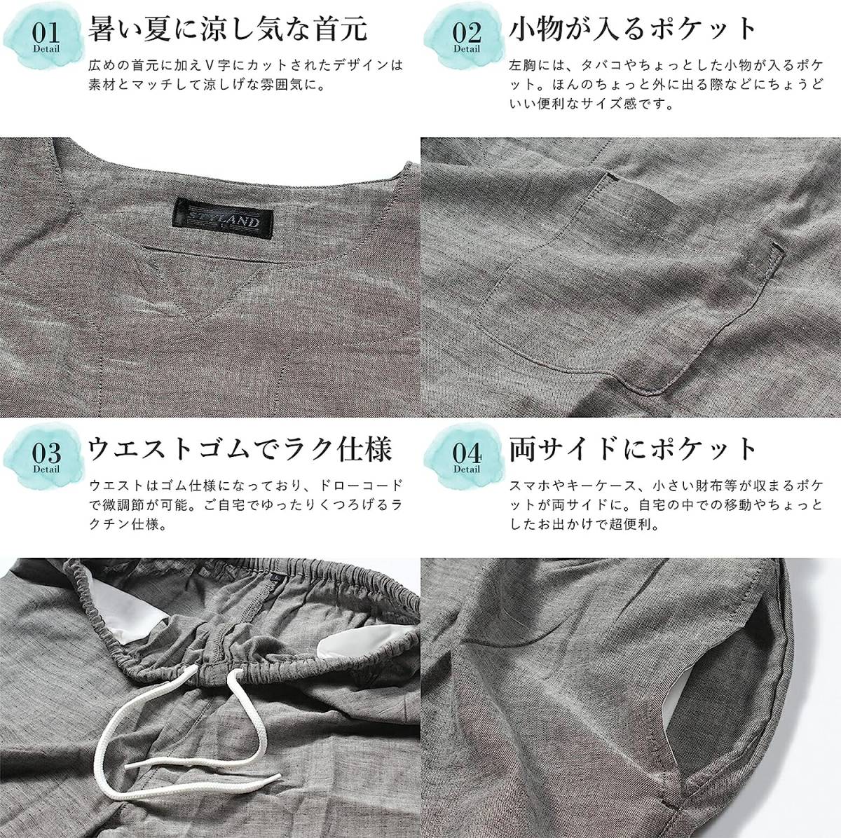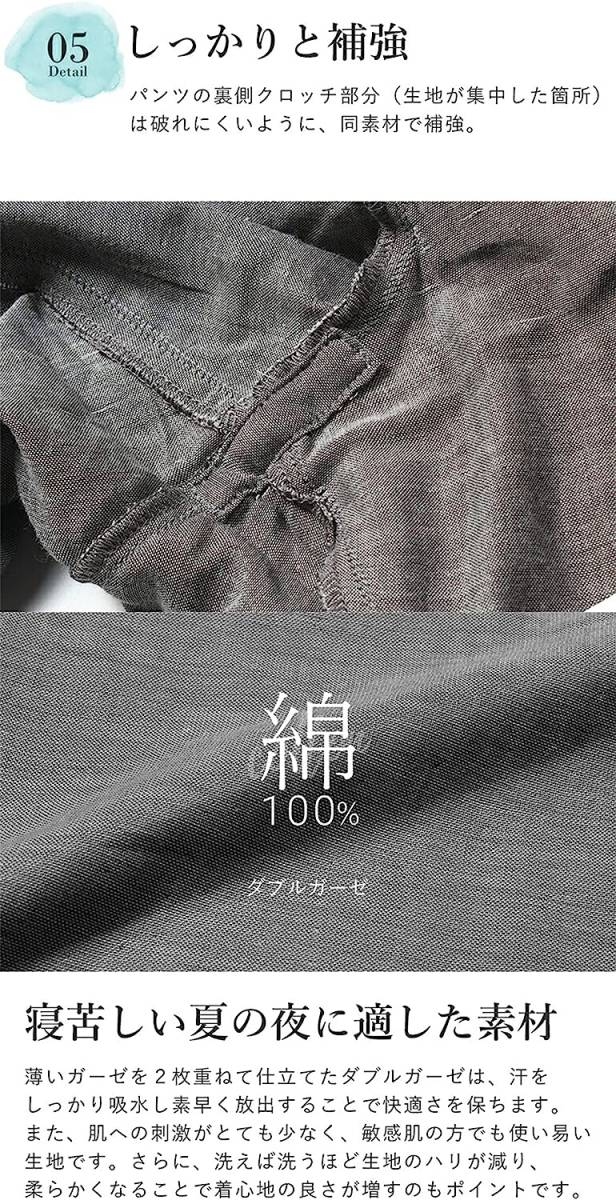 やらかい手触り、優れた通気性と吸水性を備えた。生地が柔らかく、肌触りがよいルームウェアです。寝心地も抜群 ! 着心地が良い生地です。 洗濯機でもOKです。