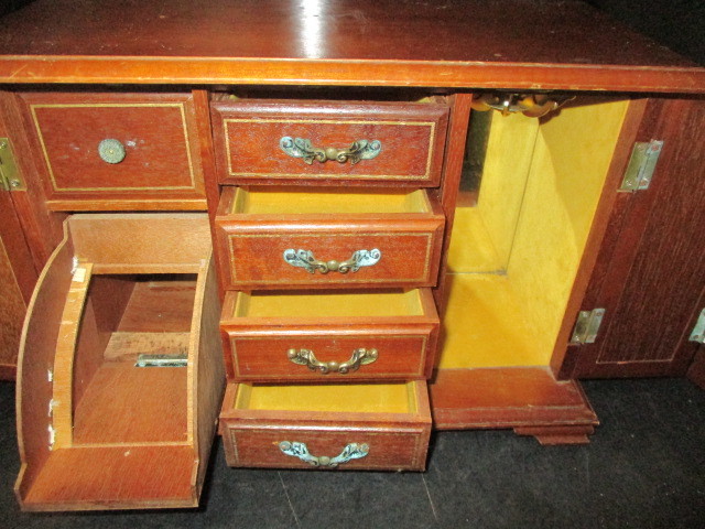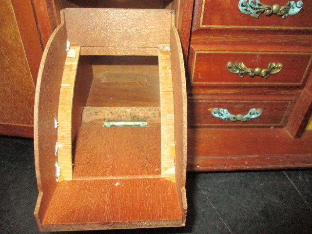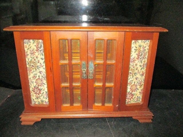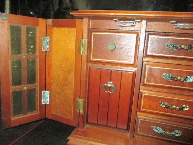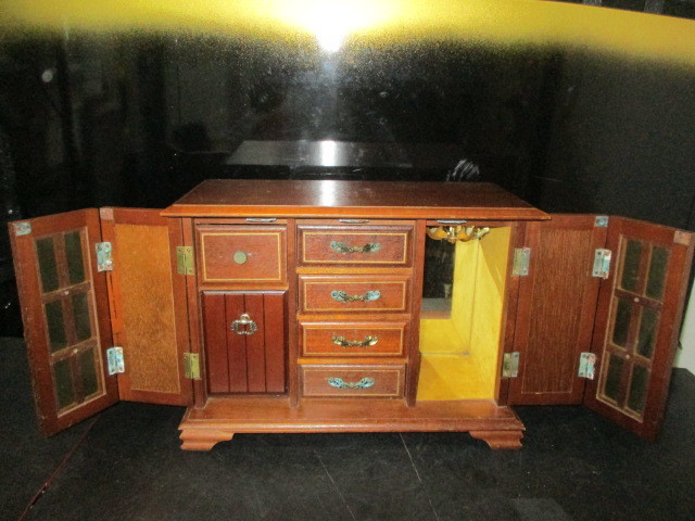 古き良き時代の完成度の高いアクセサリーケースです 丁寧いに作られたアクセサリーケースです サイズ横幅 約36㎝5mm 奥行 約17cm 高さ約16㎝多少の誤差あります 表面左右にゴブラン織りが施してあります 観音開きの小窓があり金具は真鍮か銅かと思います 独特な青錆が出ています 中央に小さめの引き出しが4個 左側上に大き目の引き出しが1個その下に布張りがあったと思いますが、現在布はありません 写真で確認して下さい 右側にはアクセサリーを下げる金具が付いています その後方は鏡張りになっています 本体に目立つ破損などはありませんが古い物です 傷 汚れ布欠品などがあります 経年劣化による痛み曲がり味わいが理解出来ない方はお辞め下さい 写真が全てになります 引き取り出来ます 宜しくお願いします