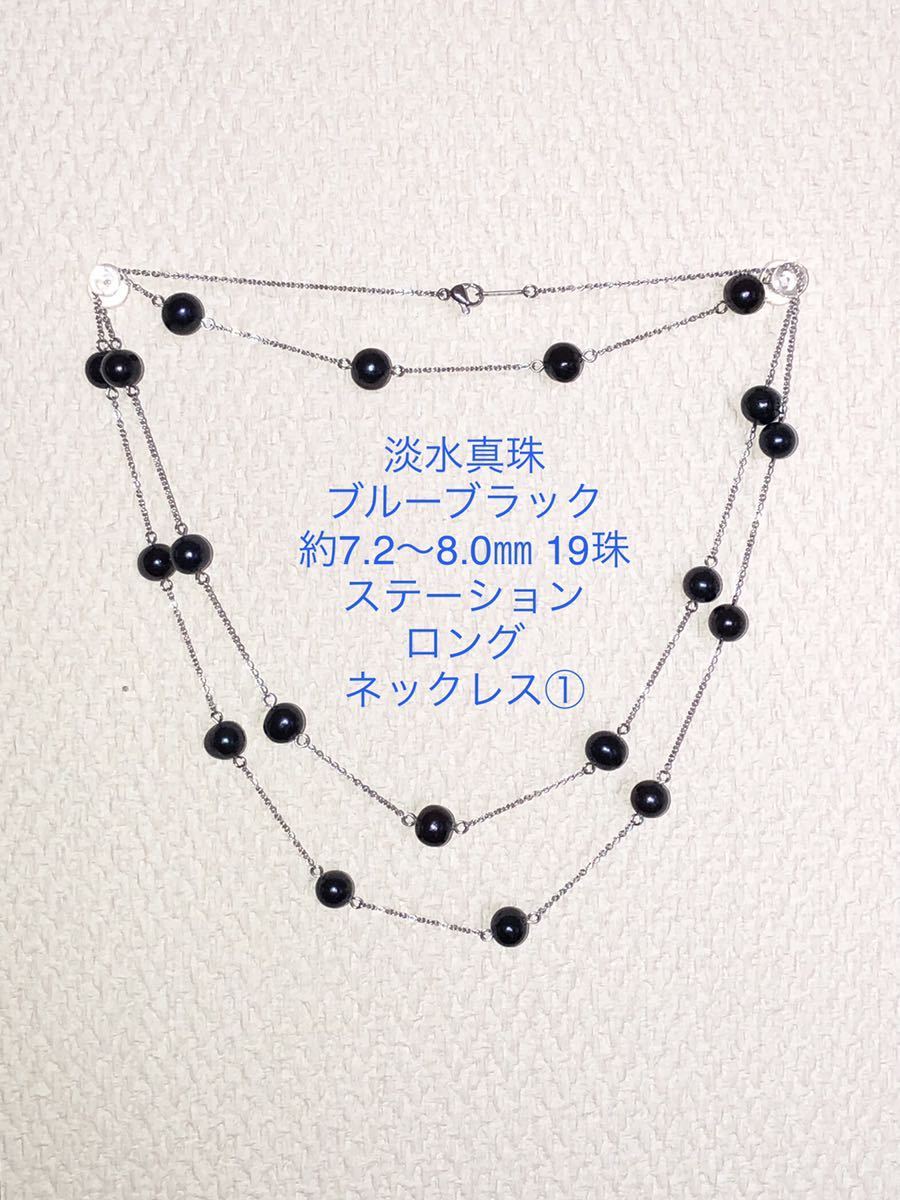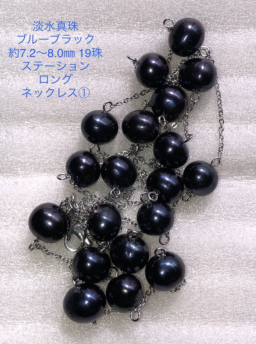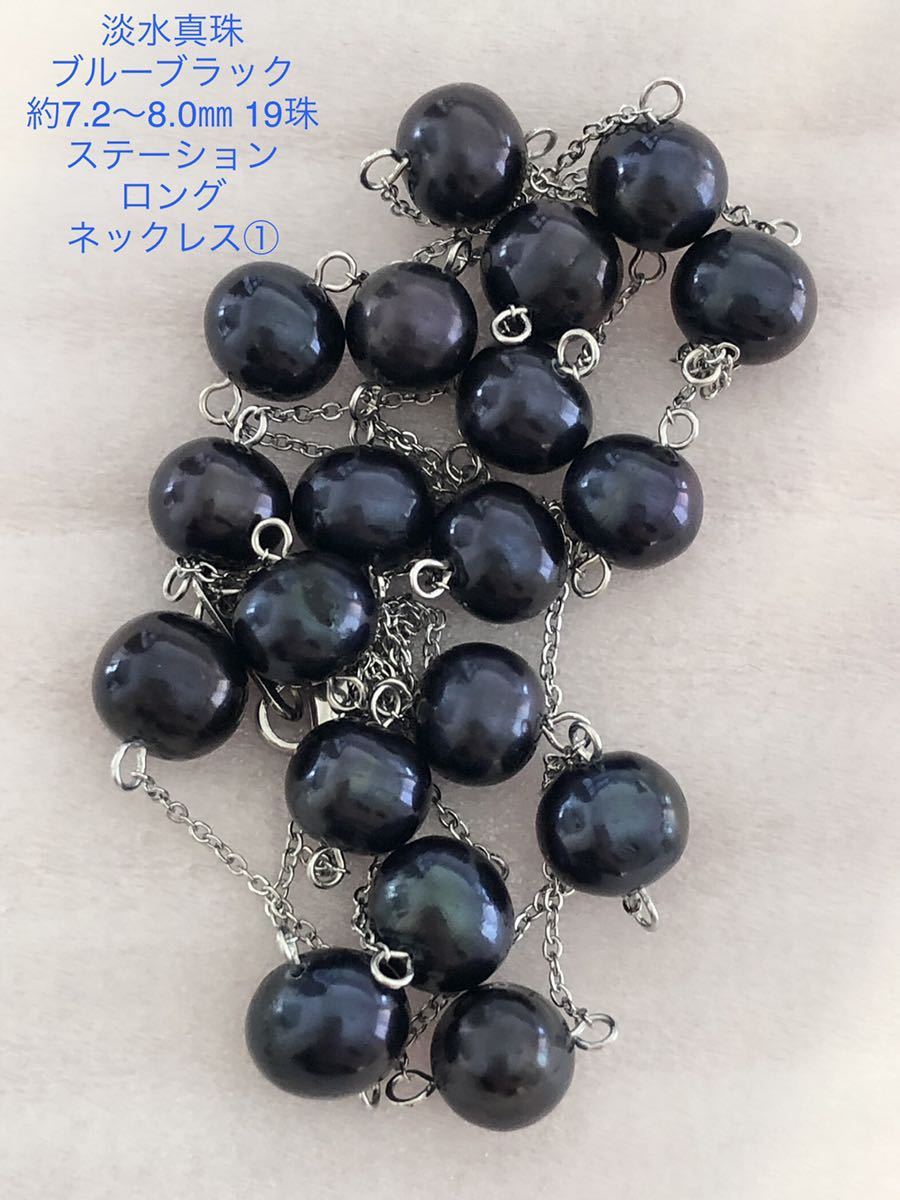 淡水真珠(約7.2〜8.0㎜×19珠 ブルーブラック系染め)の中古珠を使ってハンドメイドしたステーションロングネックレスになります。