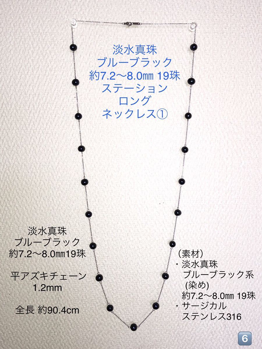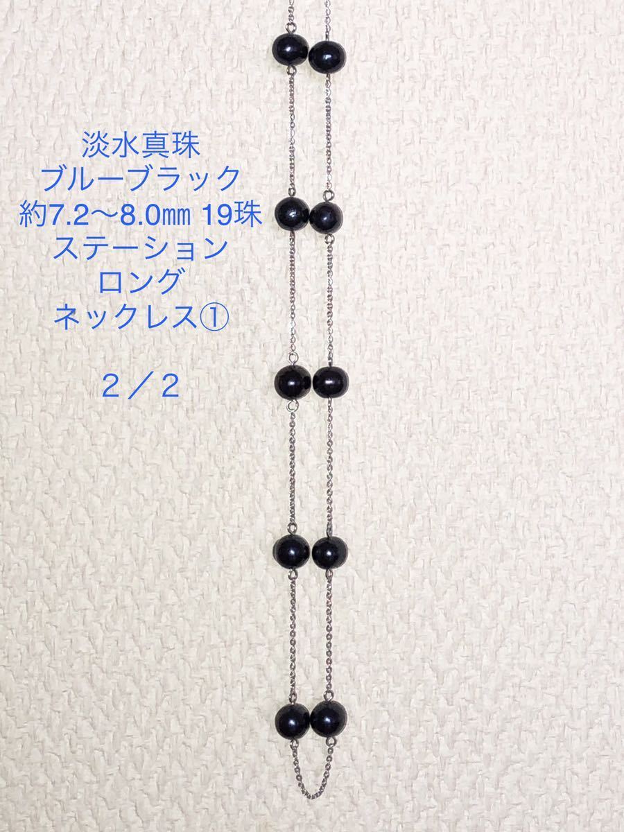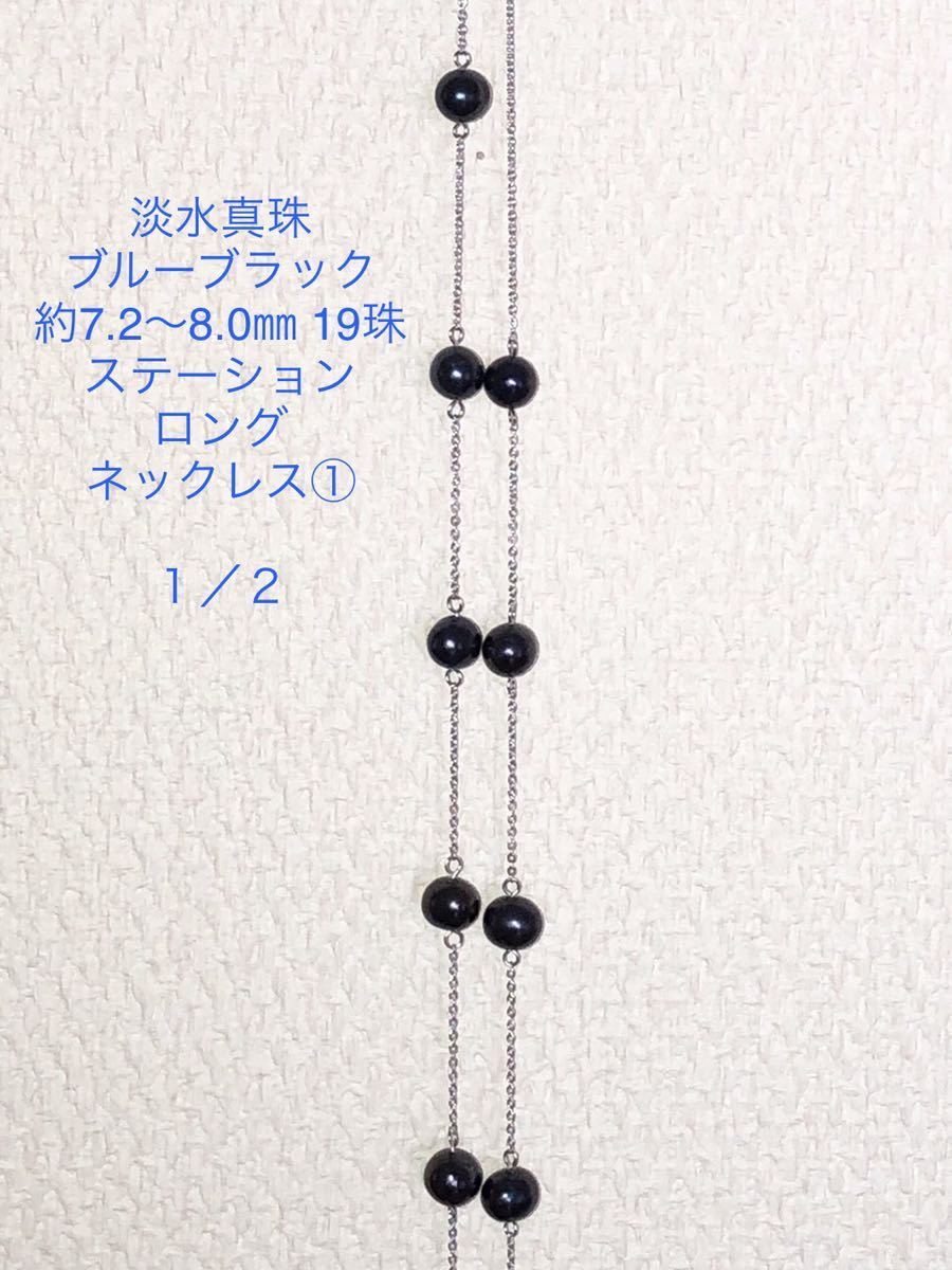 淡水真珠(約7.2〜8.0㎜×19珠 ブルーブラック系染め)の中古珠を使ってハンドメイドしたステーションロングネックレスになります。
