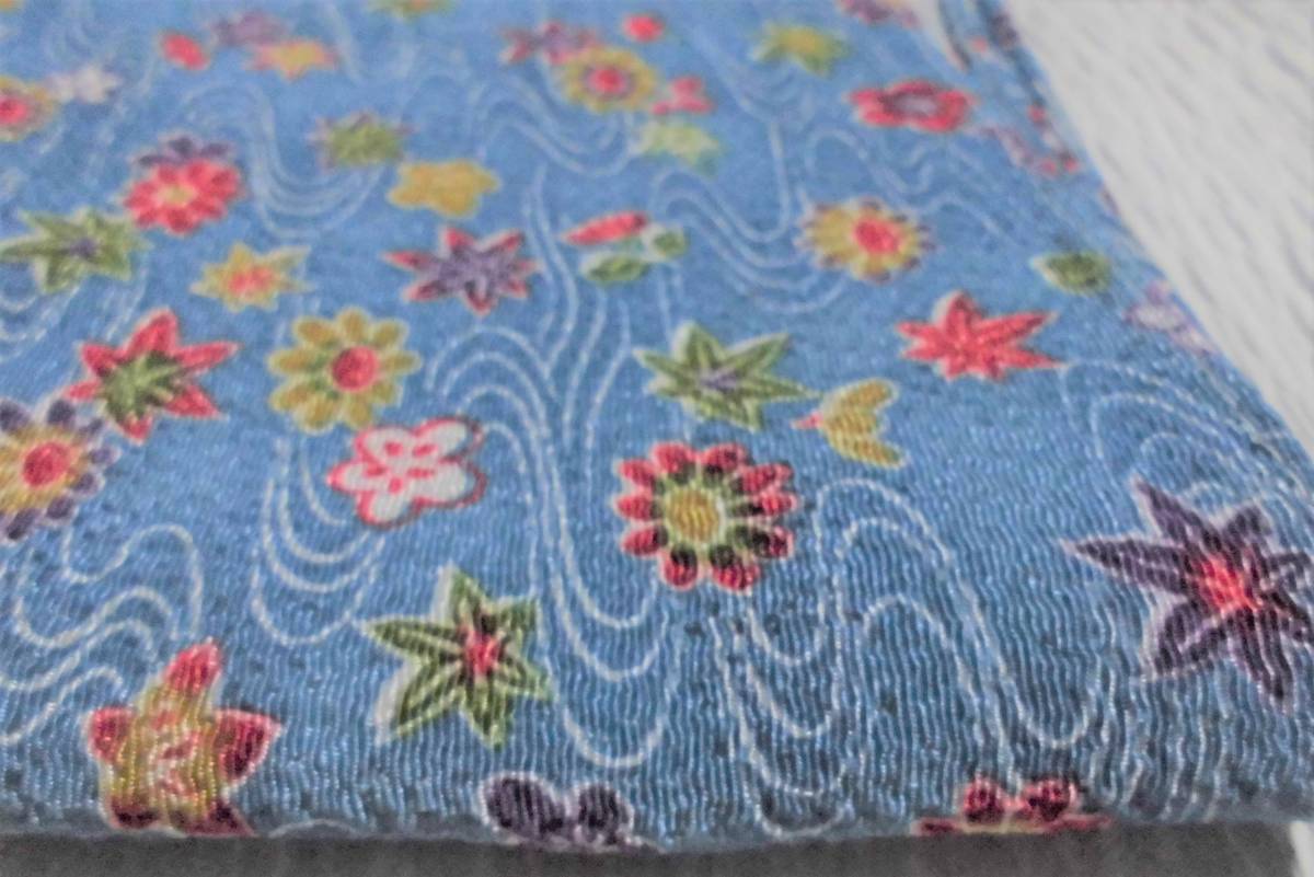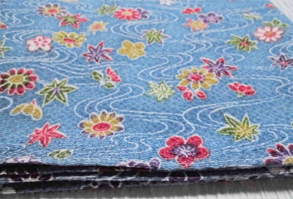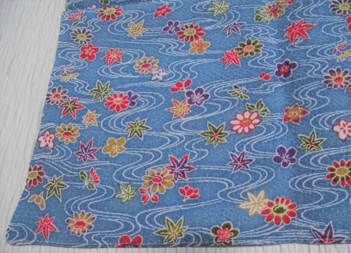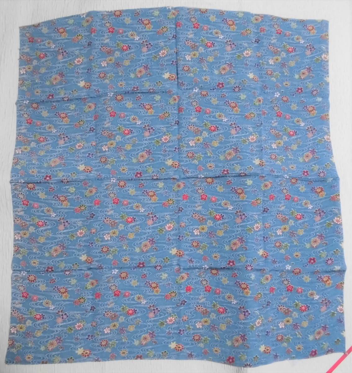 きれいなブルー地に流水、紅葉、菊、梅等が染められた縮緬の風呂敷です。