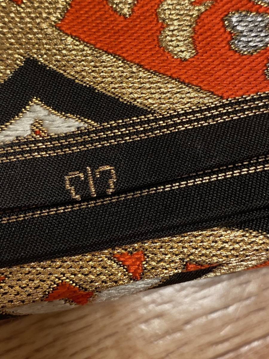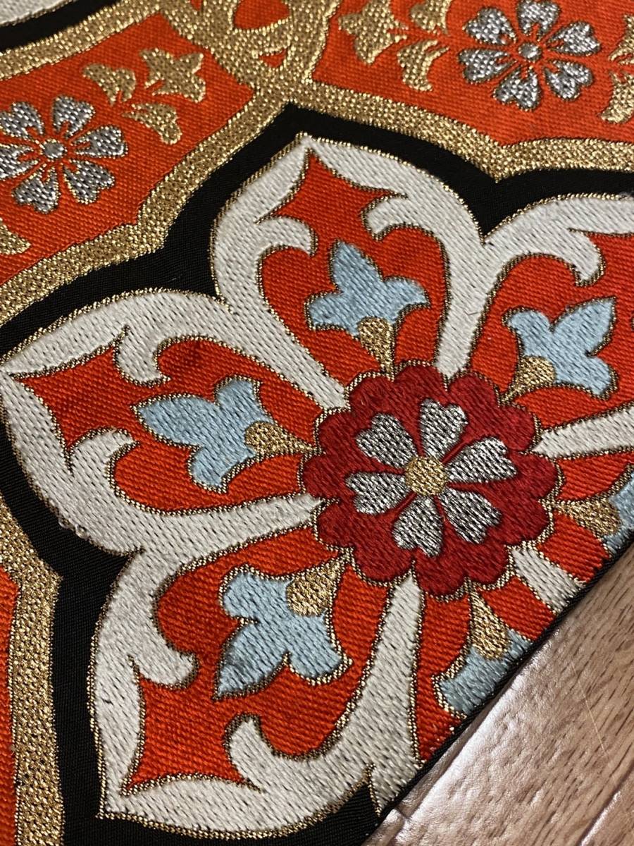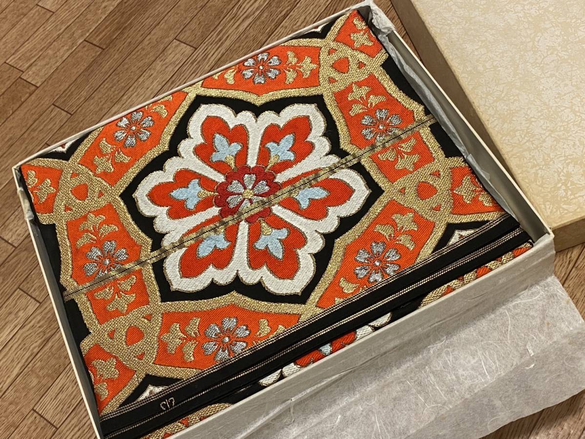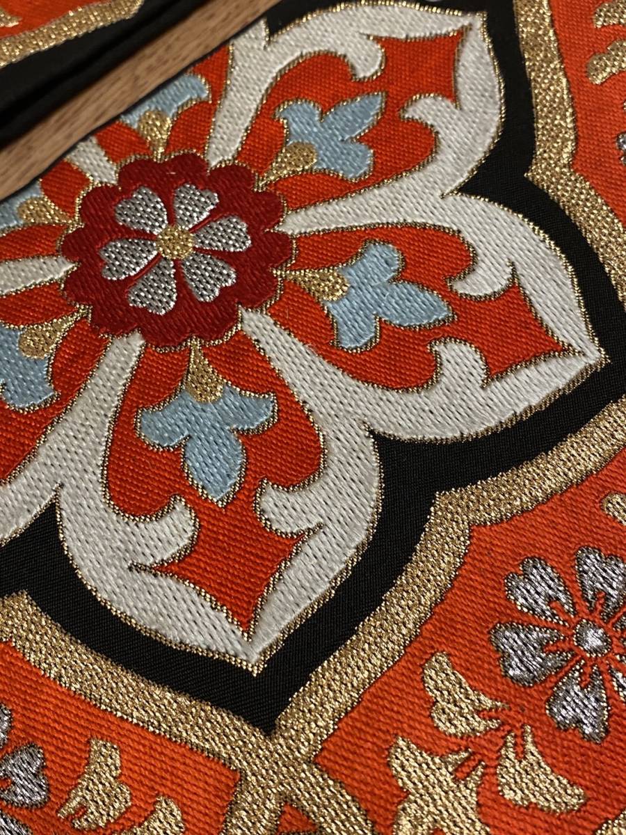 川島織物 西陣 落款 正絹 袋帯 朱色オレンジ金ゴールド セミフォーマル 全通 華花文 箱有