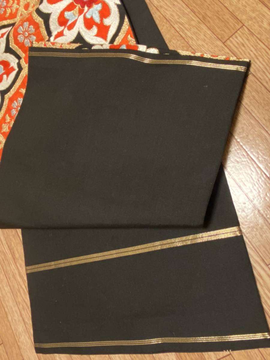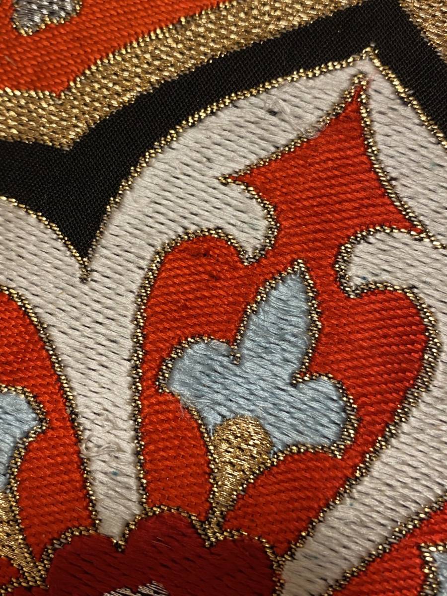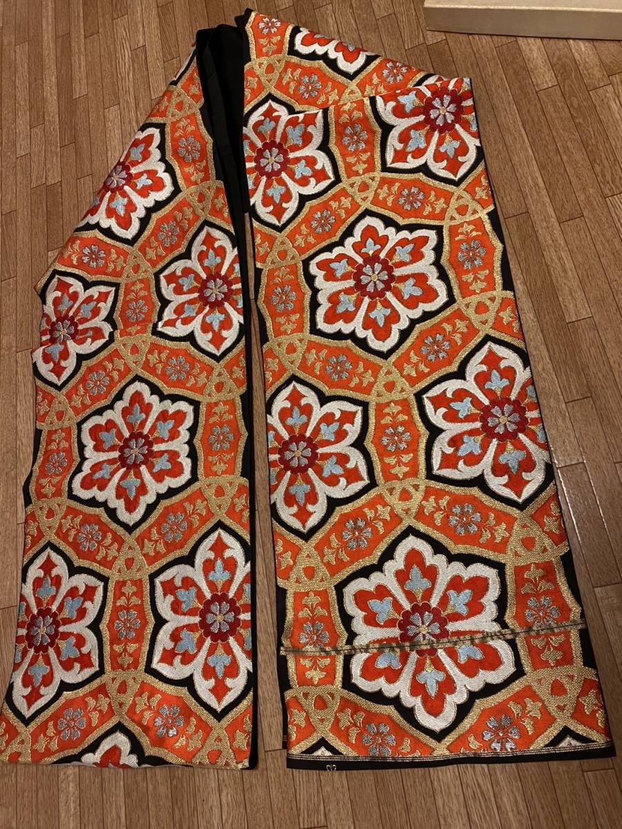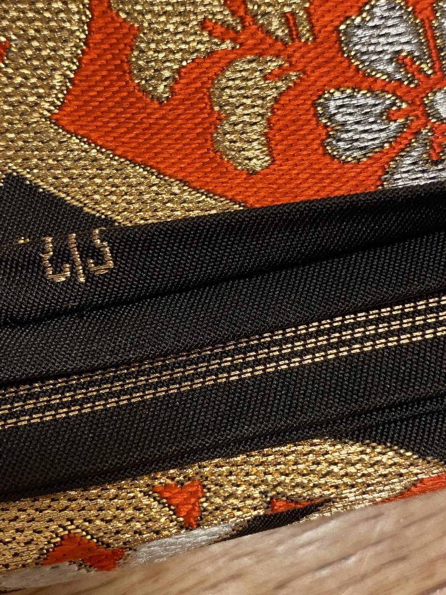 川島織物 西陣 落款 正絹 袋帯 朱色オレンジ金ゴールド セミフォーマル 全通 華花文 箱有