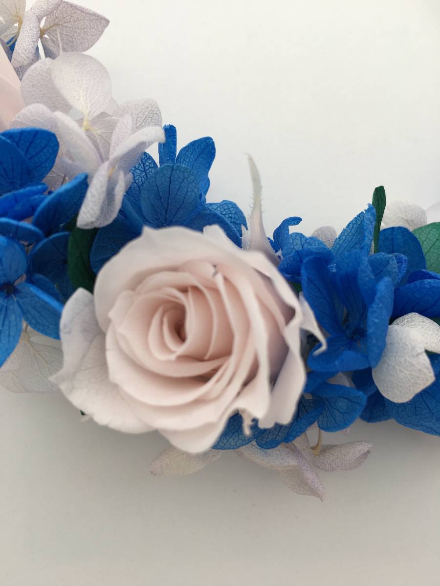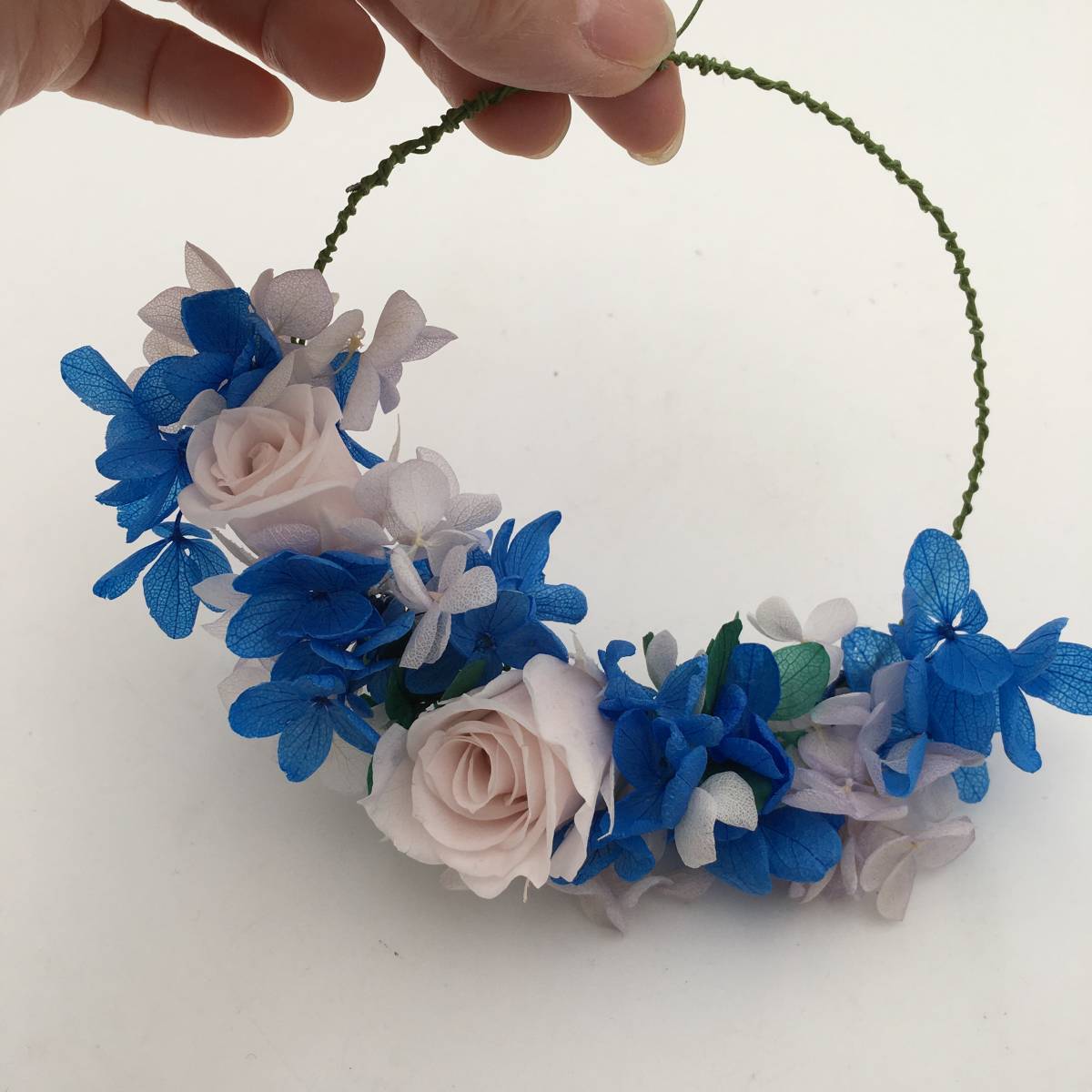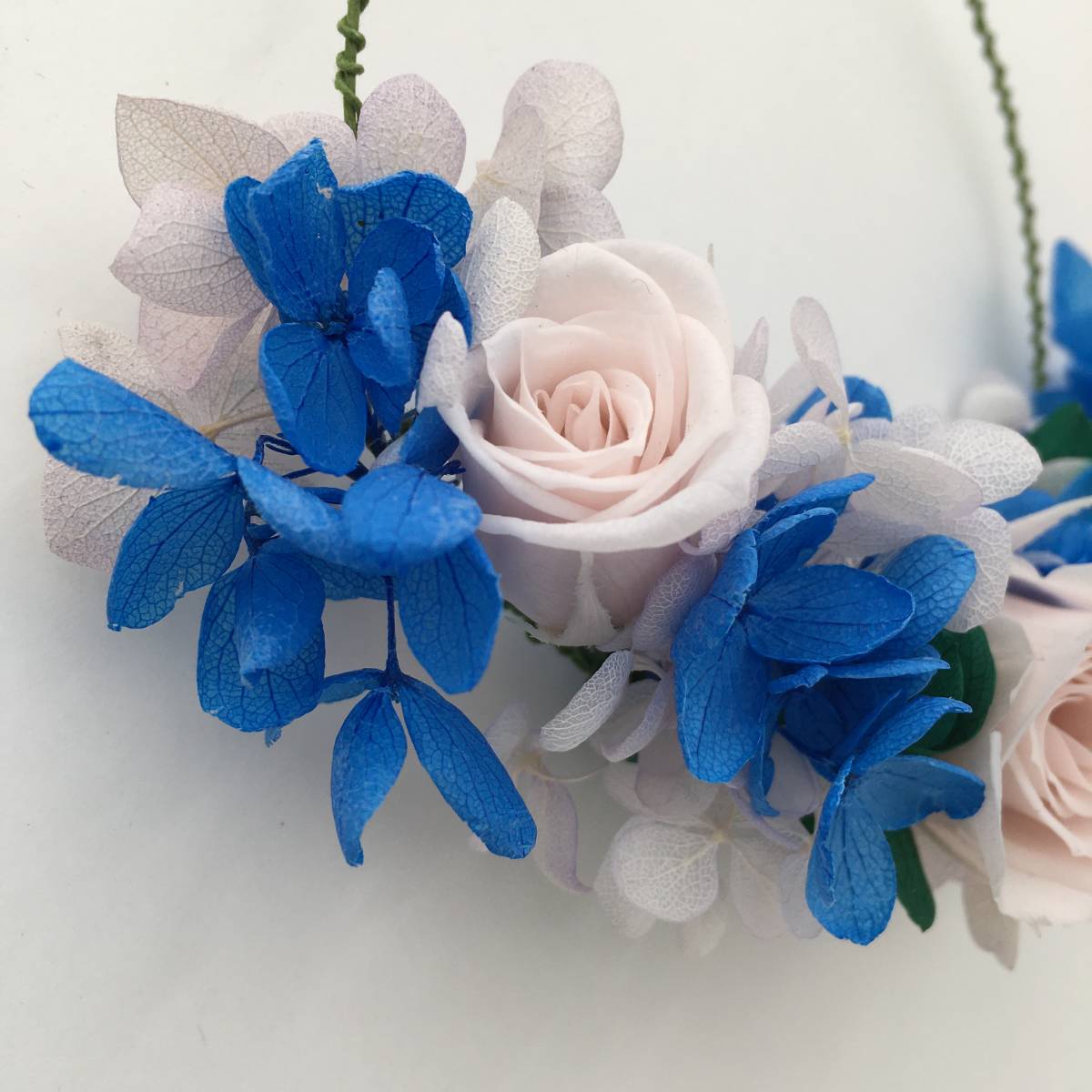 素材:プリザーブドフラワー(バラ、あじさい)、ワイヤー