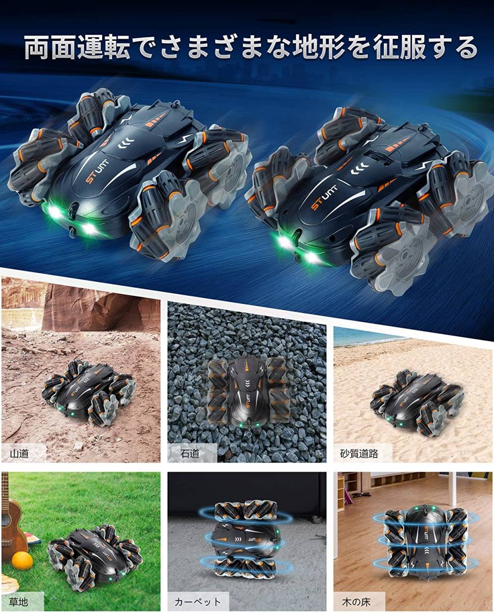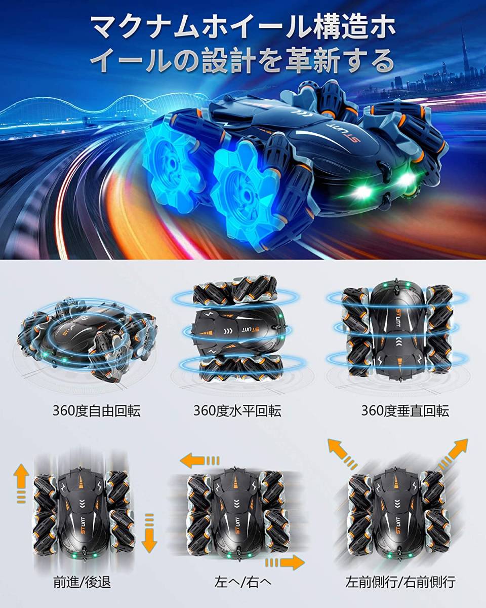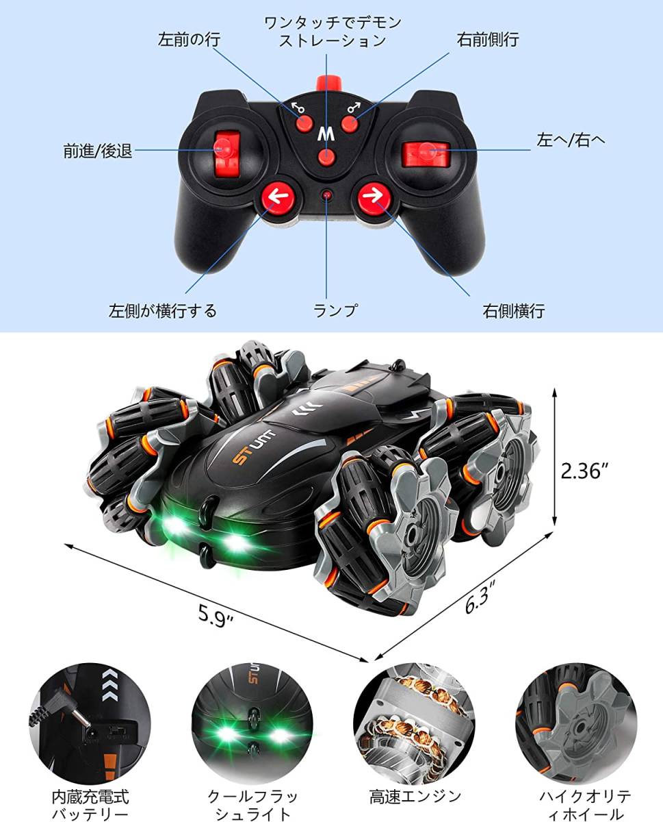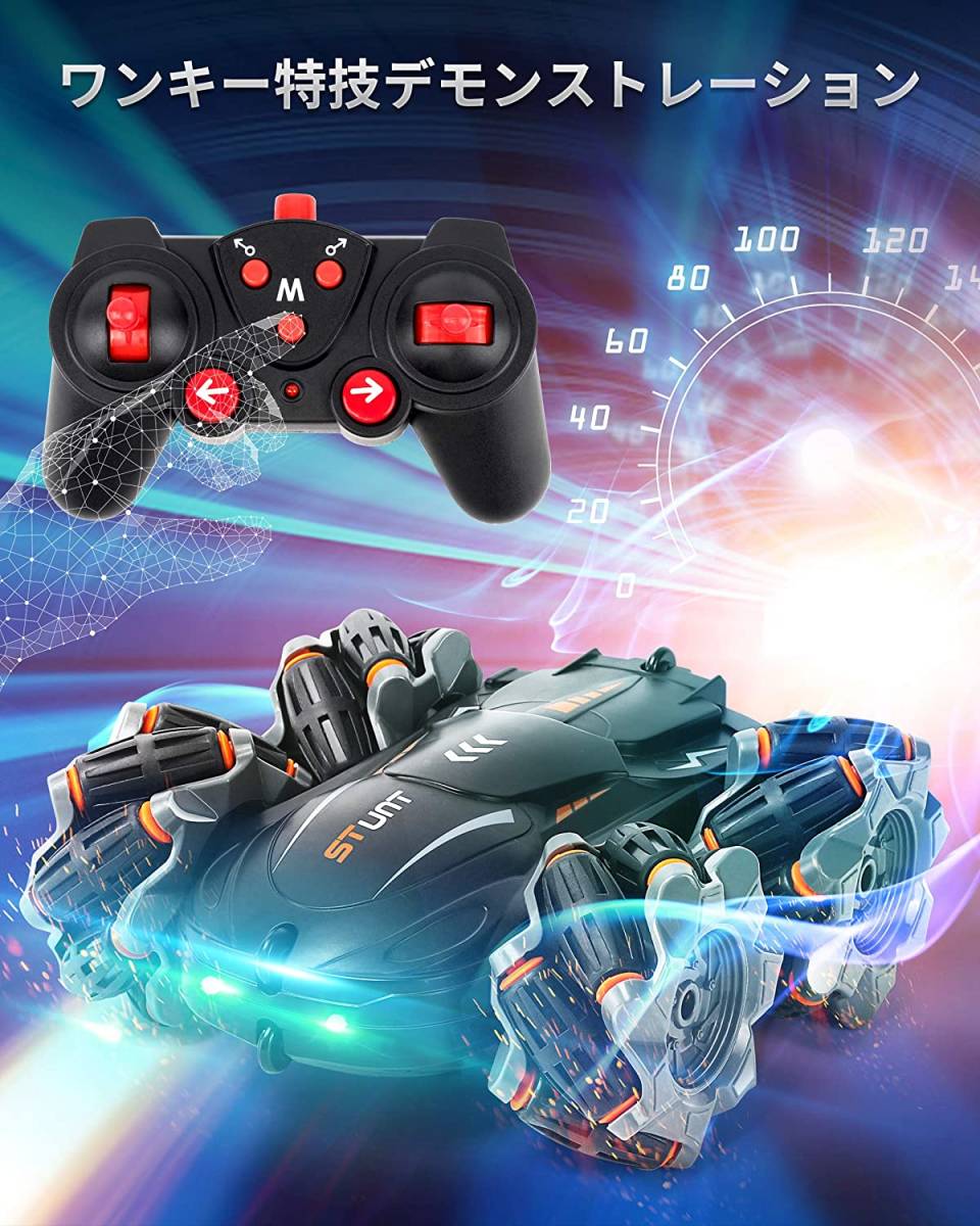 こども向けスタントラジコンカー!分解不要で充電可能 360度回転やメカナムホイールデザインで両面走行可能 四輪駆動オフロード車 おもちゃ