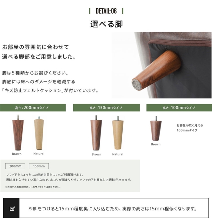 | 木脚、樹脂脚ともに脚の高さが15mm程度奥に入るので, 取り付けた際に15mm入り込みます。 |
