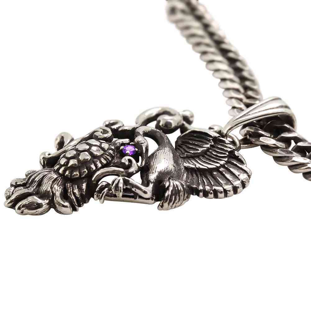 2月誕生石アメジストを使用したシルバー製の、鶴と亀モチーフのメンズネックレス(ペンダント)です。