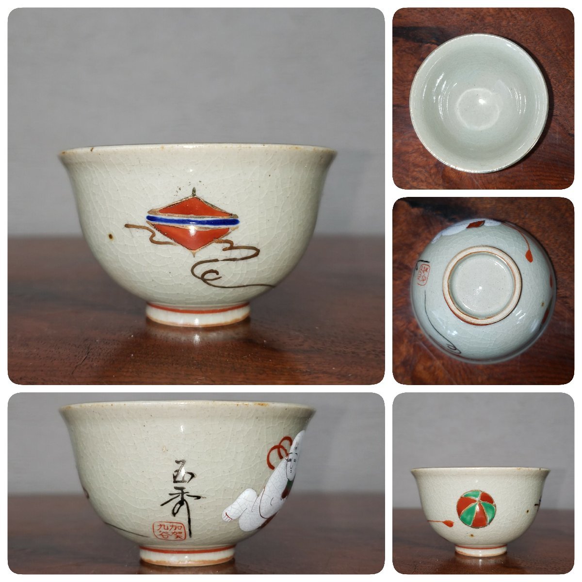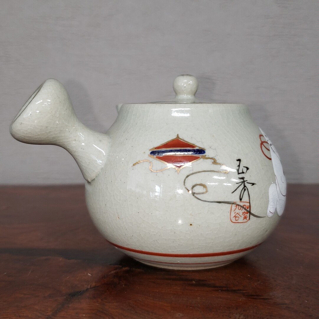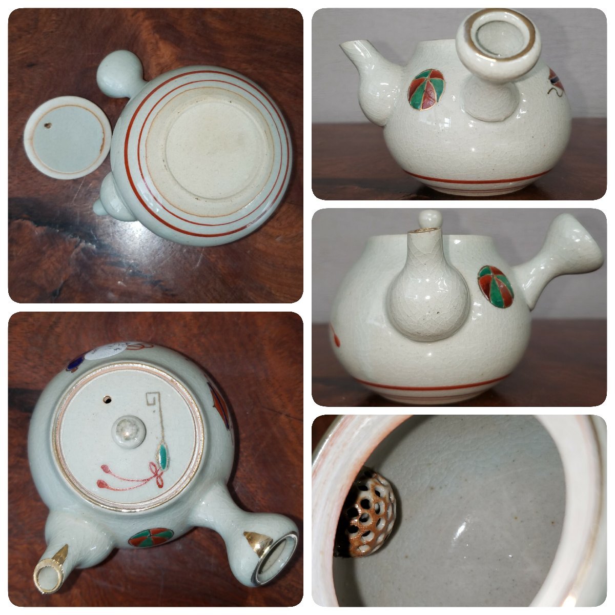 古い加賀九谷焼の茶器セットです。経年による汚れ、擦れ、貫入があります。絵柄の変色や擦れもあります。大まかに拭きましたが急須の中の細かい部分は汚れが残っています。割れ、欠けはありません。