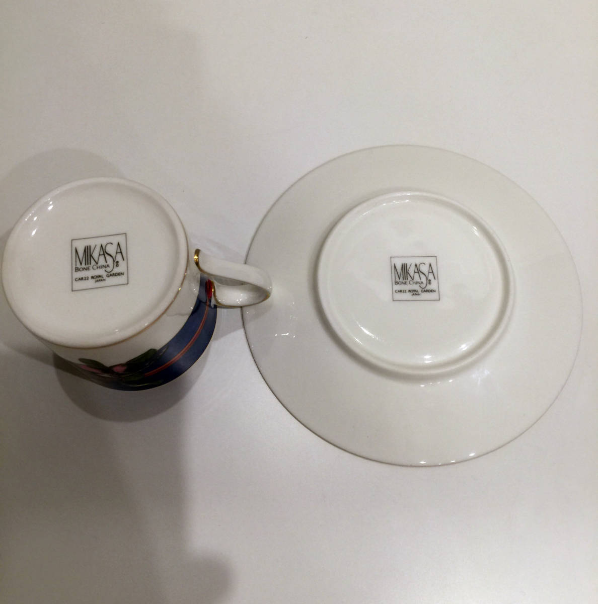 即決 デッドストック 新品 MIKASA MIYAO カップ&ソーサー 花 フルーツ柄 金彩 ミカサ アンティーク 1980年代当時もの ティーカップ 果物 fruit 青