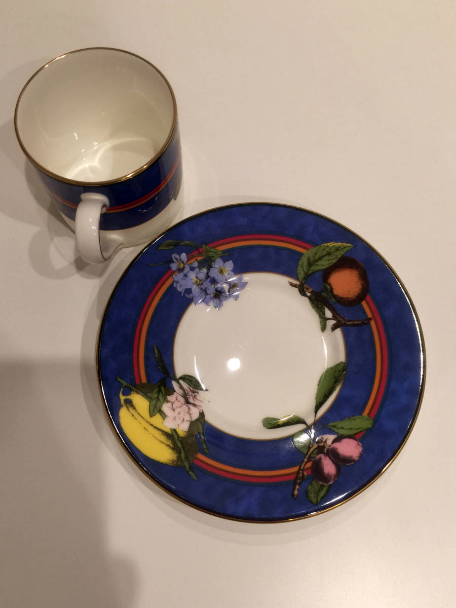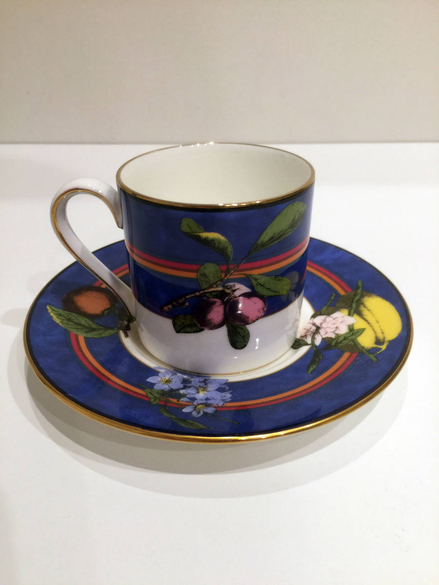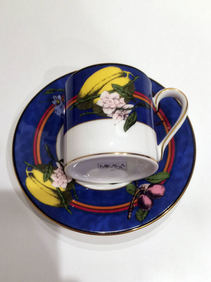 MIYAO by MIKASA のカップ&ソーサー 青を基調にした 花&フルーツ柄 金彩です
