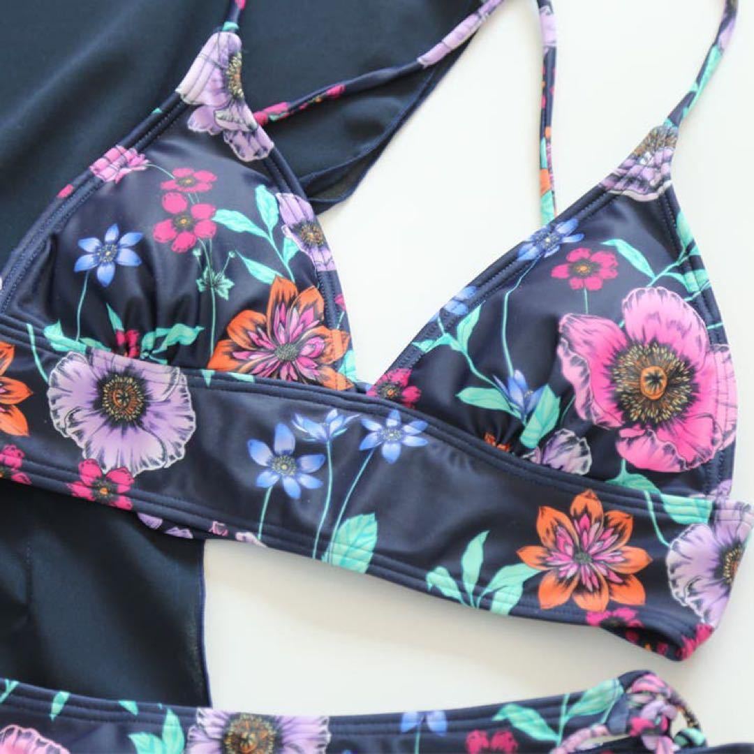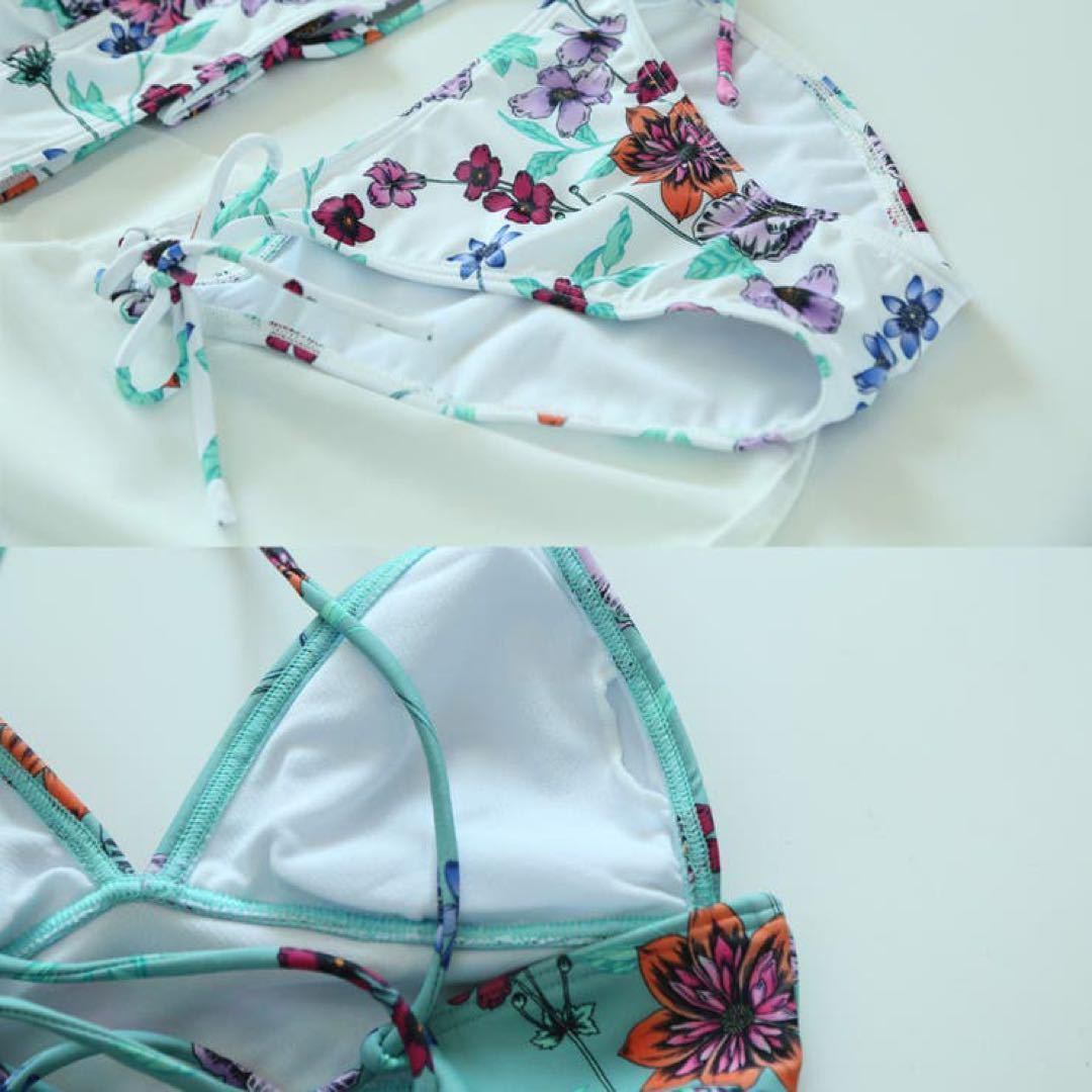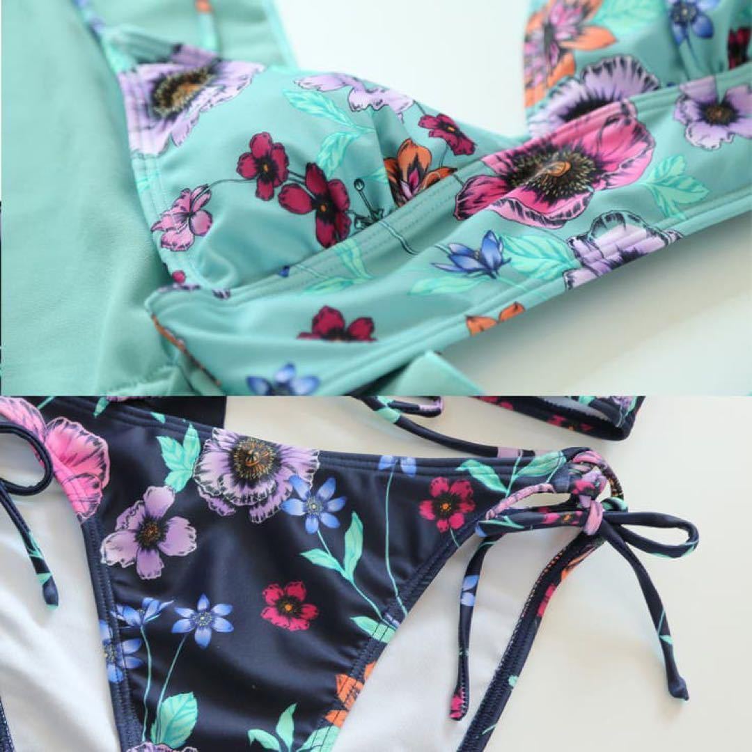★鮮やかな花柄が海やプールにピッタリ。ショーツサイドはリボン結び。