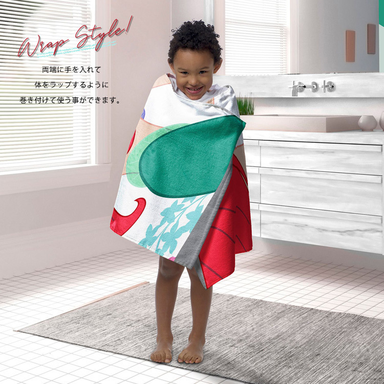 | 仕様 | お風呂上りやプール、海水浴だけでなく、寒さ対策や日よけ・暑さ対策にも大活躍 ラップの様に巻きつけるスタイルでフードも被って 日焼け、けが、害虫からお子様をガードし、冷えからお子様を守ります! 素材はコットン100%で乾きやすく ソフトな肌触りで毎日のお風呂上がりやプールの時間が楽しみ! なりきりコスチュームの様に、お友達にも大人気間違い無し! |
