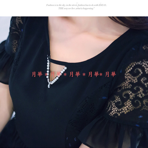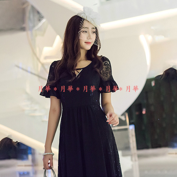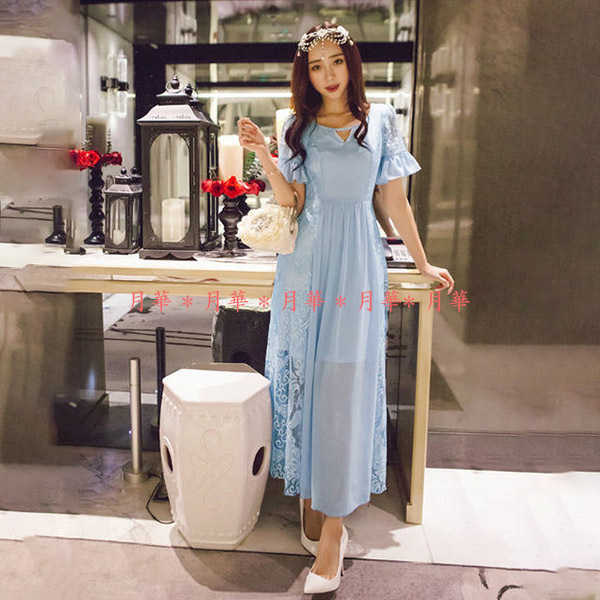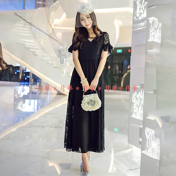 上質素材を使い、気品が溢れるレース、シフォン切替半袖ロングドレスワンピース。