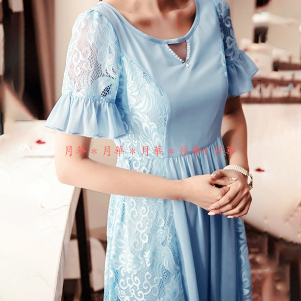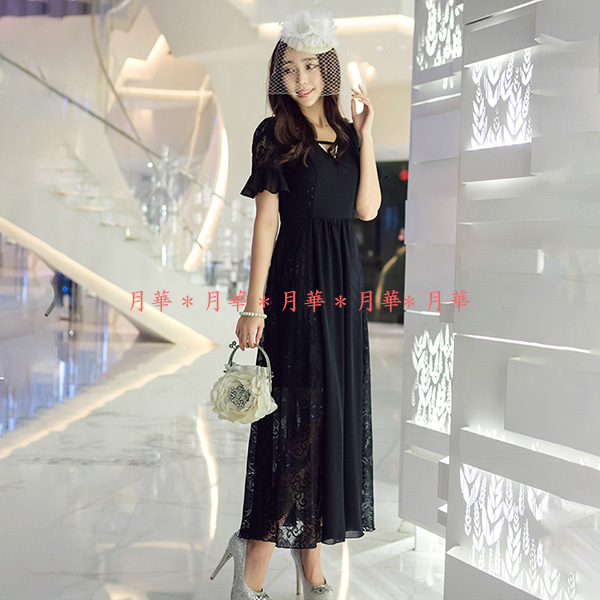 上質素材を使い、気品が溢れるレース、シフォン切替半袖ロングドレスワンピース。