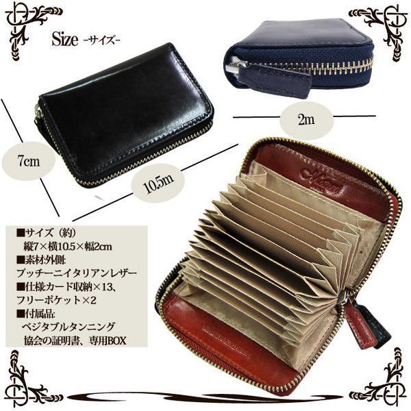 扇のように大きく開き、必要なカードをひと目で見つかると同時に指も入るので取り出しやすさ抜群です。 フリーポケットを含め、合計15ヶ所に収納可能。 ポイントカードや診察券でいっぱいの財布をすっきりしてくれる、便利なアイテム。 高い生産基準を満たした「イタリア・ベジタブルタンニング協会」認定の高品質イタリアンレザーを大胆に使用し、 飽きの来ないシンプルかつスタイリッシュなデザインに仕上げました。 カラー・仕様共に、年齢問わずご愛用いただけるカードケースです。 ■カラー:ブラック、ネイビー、ライトブラウンよりお選び下さい。 (落札時、オーダーフォームにてご希望のカラーをご連絡下さいませ。ご連絡がない場合は、当店でカラーを選択させて頂きます。) ■サイズ(約):縦7×横10.5×幅2cm ■素材:外側/プッチーニイタリアンレザー、内側/ナイロン ■仕様:カード収納×13、フリーポケット×2 ■付属品:ベジタブルタンニング協会の証明書、専用BOX 【ベジタブルタンニング協会の証明書とは】 イタリアの伝統的な革なめし業に従事するタンナーが所属する組合。 小さな血筋、しわ些細な傷は天然素材の証明でありそれぞれの革をこの世で唯一のものにしています。 メンバーが供給するレザーには環境への配慮、皮革の自然さ、鞣し行程の高い生産基準などの条件を満たした、 高品質なイタリアでなめされたベジタブルタンニングレザーであるという証の証明書が付きます。 また、証明書にはシリアルナンバーが一枚一枚印刷されており、偽造出来ない唯一無二のものです。 【訳あり商品】 こちらは新品・未使用ですが、製造過程による細かい傷、ノリ汚れ、擦れ等がございます。 通常のご使用には問題ございませんが、神経質な方は入札をお控え下さい。 ※こちらの商品は全てにおいてノークレーム・ノーリターンです。 ご了承の上、入札下さいませ。 --革製品について-- ・製作過程により多少の傷、汚れ、縫い目が粗い、塗装にムラ、接着剤跡等がある場合が御座います。 ・天然素材の商品は、自然由来の素材のため革には細かなシワや傷跡・トラ等が存在する場合があります。 ※シワなどは、動物の生育環境や年齢、個体によって異なる、革の特性です。 ・商品の仕様・デザインは、製品向上の為に予告なしに変更になる場合がございます。 ・掲載している写真は、ご使用のコンピュータの環境や撮影の光加減によって実際の商品のイメージと多少異なることが御座います。 これらについては予めご理解頂いた上でご購入お願いします。 | |