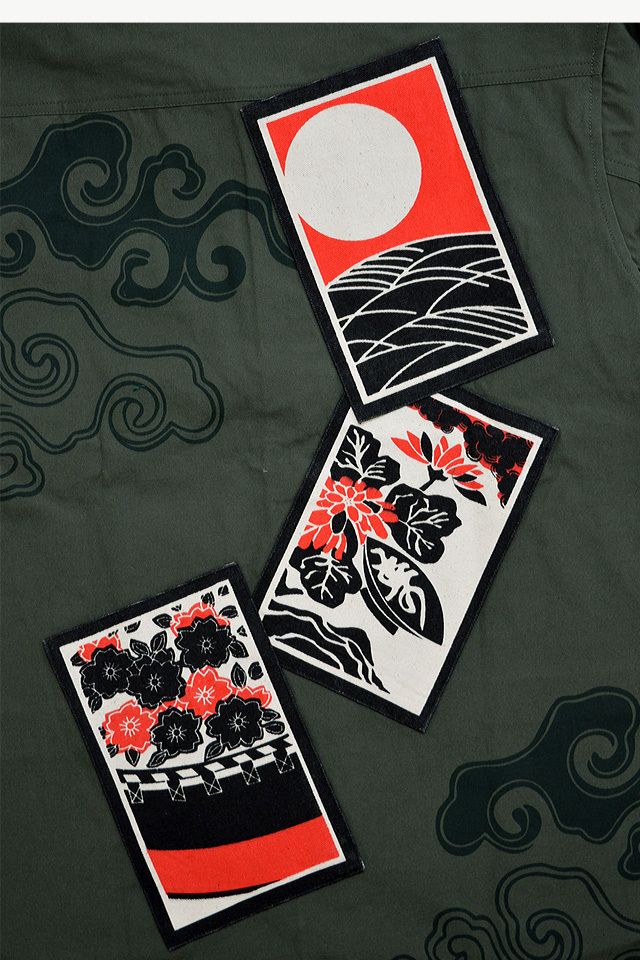 背中には帆布生地の花札が3枚縫い付けられています。