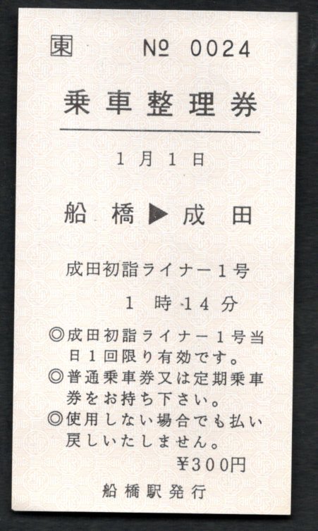 成田初詣ライナー1号乗車整理券(船橋駅)
