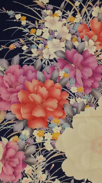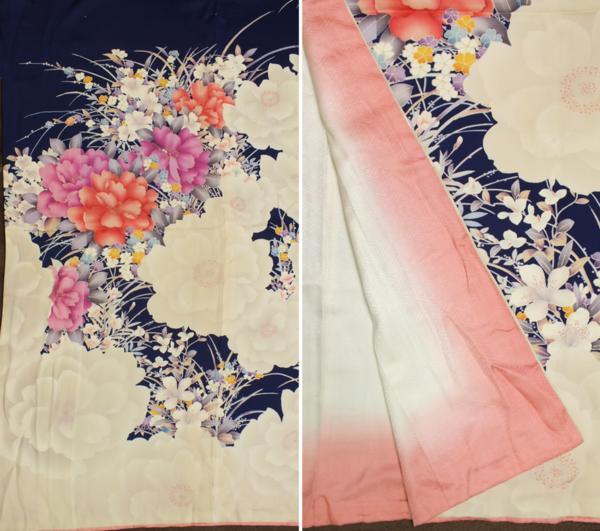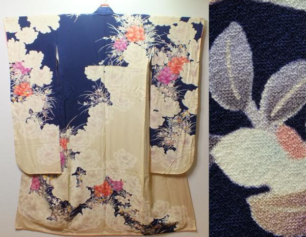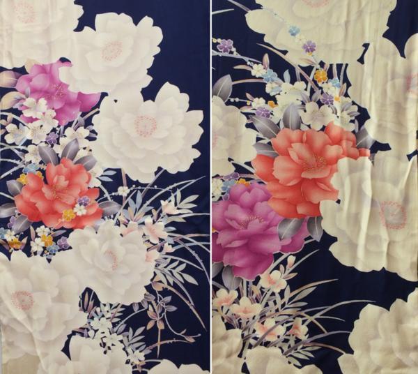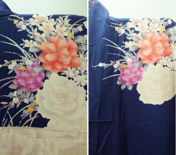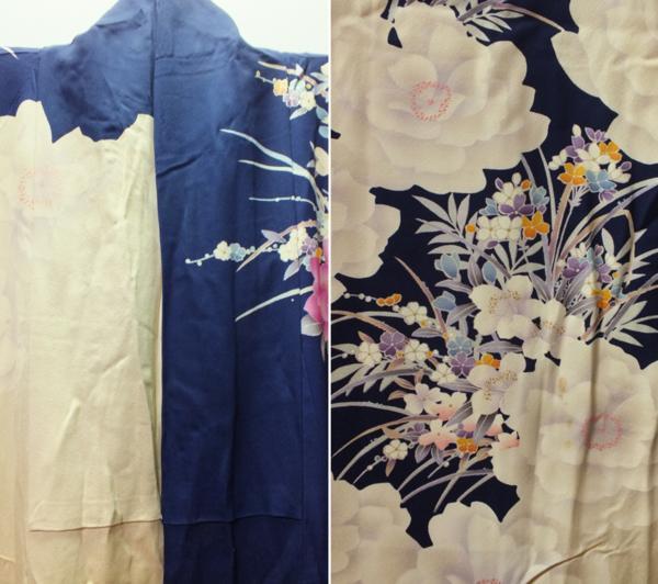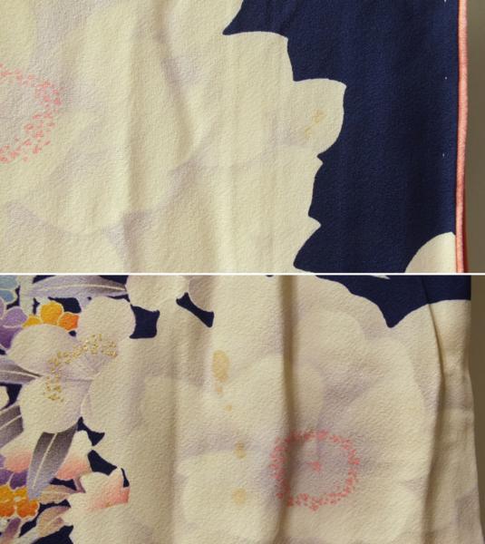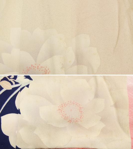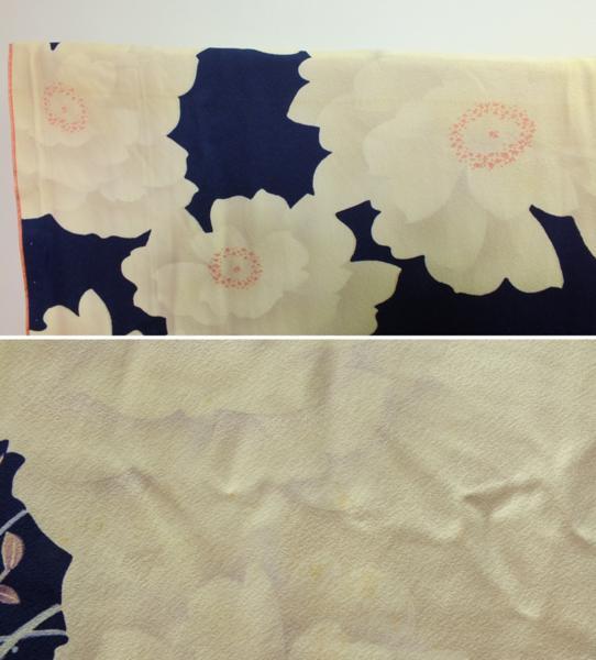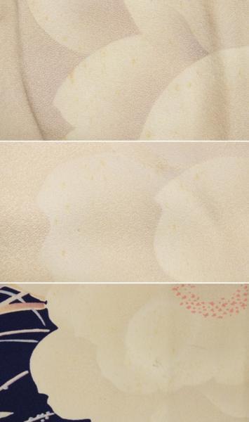 素材:正絹。着丈168.5cm、裄66.5cm、袖幅34cm、袖丈113cm、前幅25cm、後幅30cm。丈約8cm伸びます。後右袖の袖口あたりに5mmのシミが2ヶ所と袂上あたりに1cmと5mmのシミが4ヶ所あります。薄い細かいアクが前後の身頃にあります。状態は写真をご参照頂けますようどうぞよろしくお願いいたします。【撮影時の照明の加減で実物の色よりも青白く写っている場合があります。】