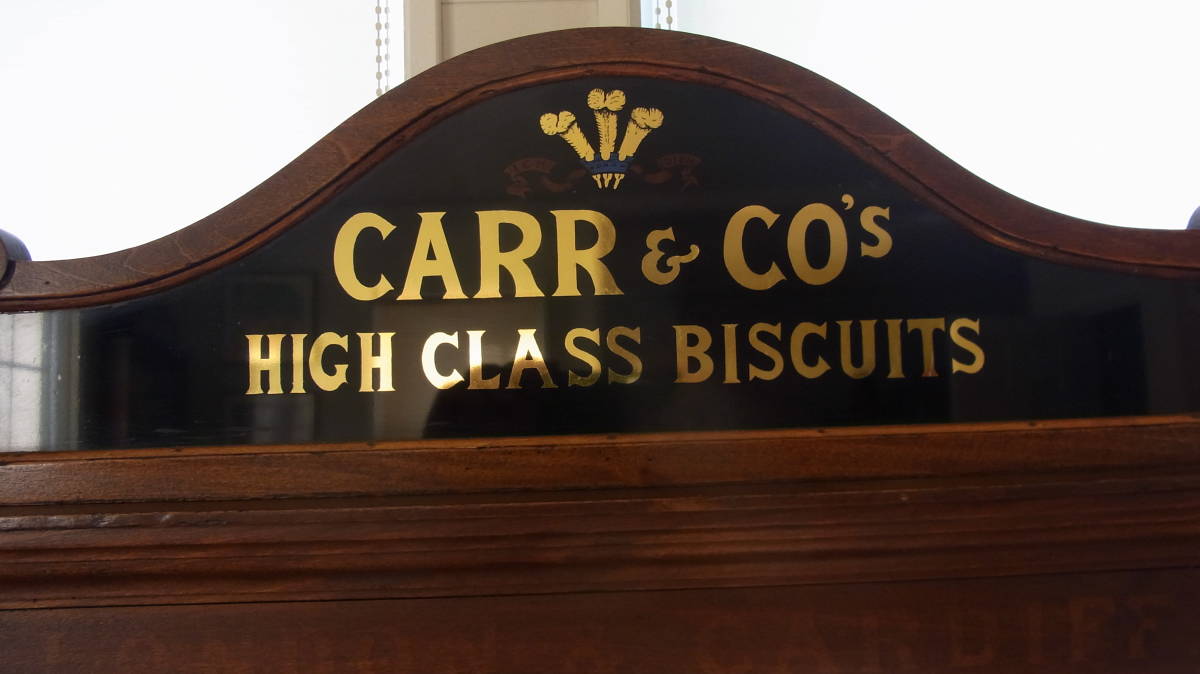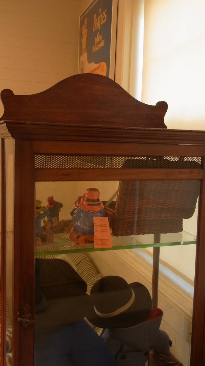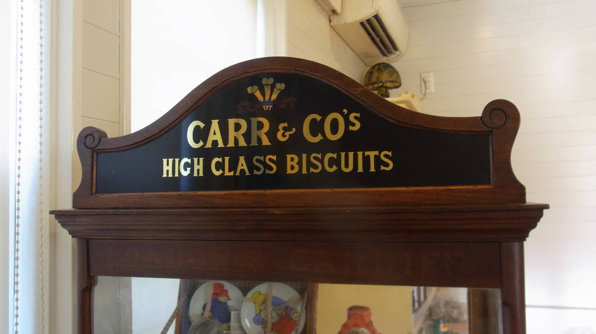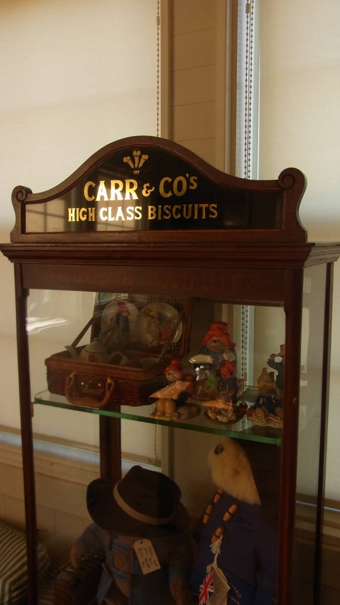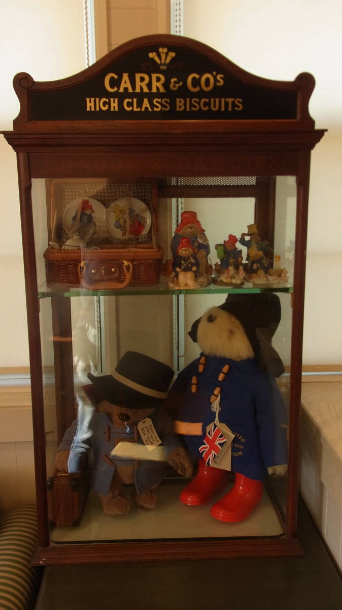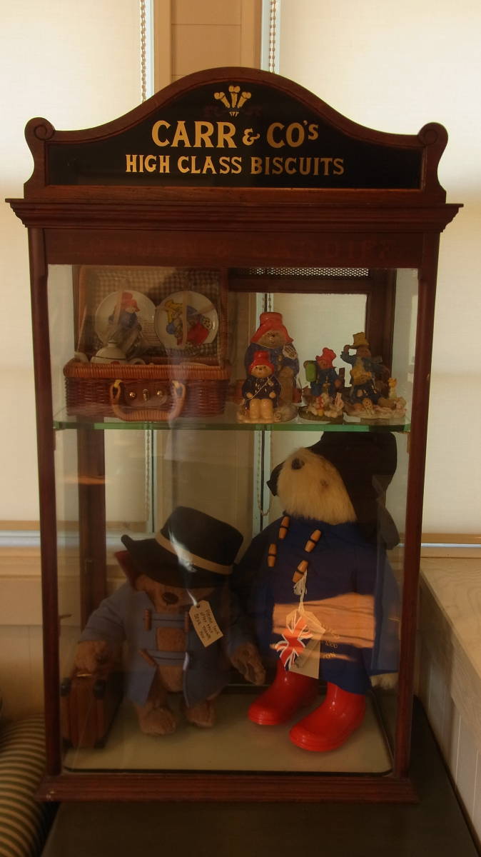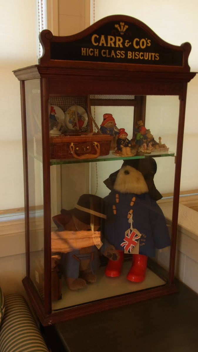1940~50年代 英国製 ビスケットが売られていたキャビネットです。ガラス棚は画像では一枚しか写っていませんが、上の棚から等間隔で下側にもう一枚はいりますので、計三段になります。キャビネットの中のパディントンは含まれません。サイズ 32X54X92センチ
