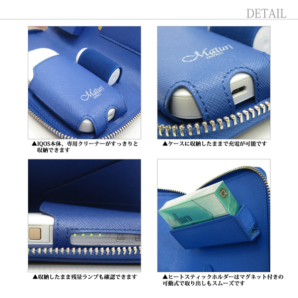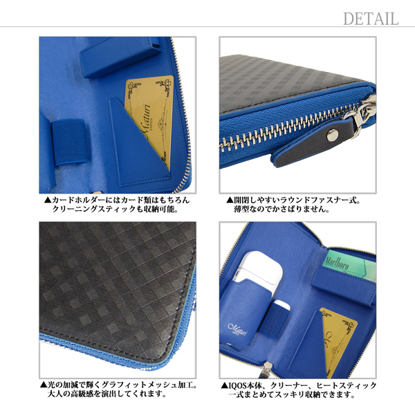 | IQOS本体、クリーナー、ヒートスティックの一式をすべて収納可能なIQOS専用ケースです。 ケースに入れたまま充電可能な本体ホルダー、手前に可動するヒートスティックホルダー等、機能性も充実 カードポケットにはICカードや定期券はもちろん、IQOSクリーニングスティックも収納可能です。 持ち歩きやすく使いやすい、飽きのこないシンプルなデザイン。 ラウンドファスナー式で中身が見やすく取り出しやすい仕様です。 ケースには、丈夫で硬質な最高峰とされるスペイン産牛革を贅沢に使用し、耐久性も抜群 光の加減で格子状に輝くグラフィットメッシュ加工が、大人の高級感を演出してくれます。 ■カラー:ブラック×ブルー ■素材:外側/牛革(スペインレザー)、内側/マイクロファイバー ■サイズ(約):横18.5cm×縦10cm×マチ2.5cm (実寸につき誤差は予めご了承下さい) ■仕 様:IQOS本体収納ホルダー×1、クリーナー収納ホルダー×1、ヒートスティック収納ホルダー×1、カードポケット×1 ■新品・未使用 ※iQOS本体や付属品、ヒートスティックは同梱しておりません。 【注意事項】 ・製作過程により多少の傷、汚れ、縫い目が粗い、塗装にムラ、接着剤跡等がある場合が御座います。 ・商品の仕様・デザインは、製品向上の為に予告なしに変更になる場合が御座います。 ・ご使用のコンピュータの環境や撮影の光加減によって実際の商品のイメージと多少異なることが御座います。 これらについては予めご理解頂いた上でご購入お願いします。 | |