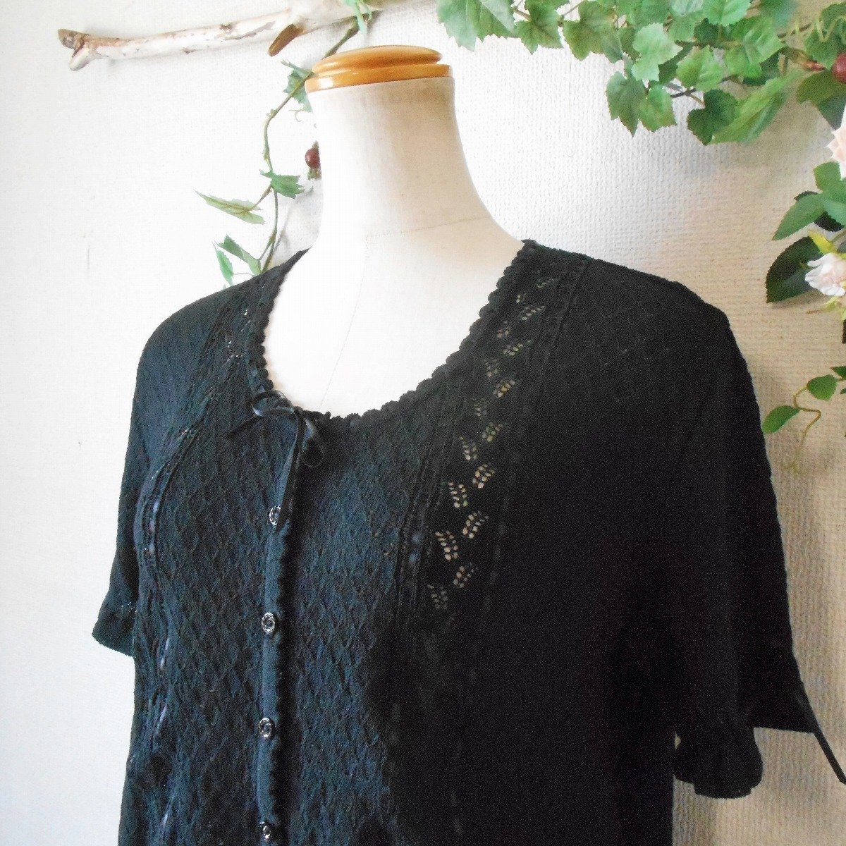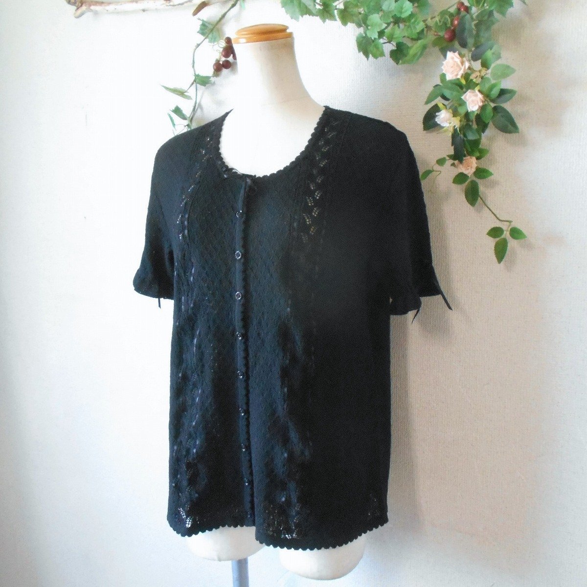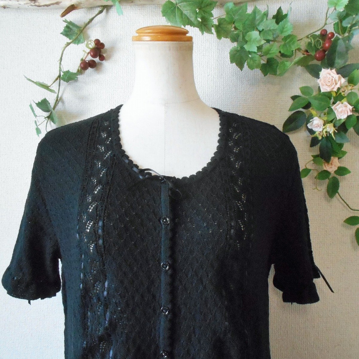 【ポイント】インゲボルグのカーディガンになります。お色は黒色で夏を中心に着ていただけるお品です。襟ぐり、お袖、前後身頃には、はしごリボンが使用された、とっても素敵な一着です。