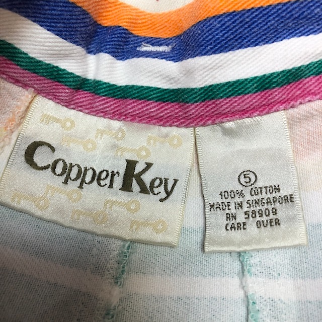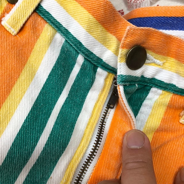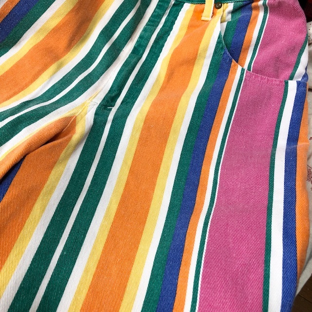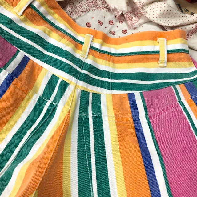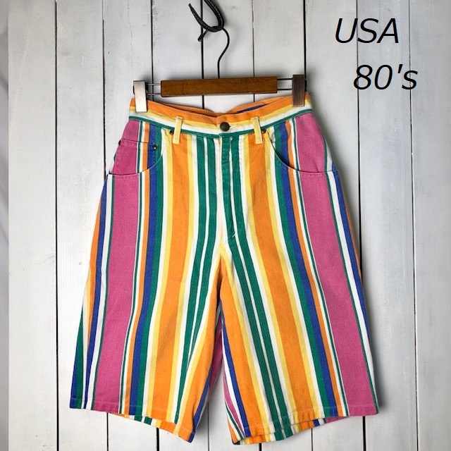 ●商品説明・・・アメリカ古着になります。80年代頃のオールド・ヴィンテージのカラフルなマルチカラーで、ランダムなピッチ幅のマルチストライプのハーフデニムパンツです。春夏向けな明るくPOPな色合いで、デニムも通常のオールドデニムに比べて若干ライトオンスで、オールド古着としてとても可愛い一着です。素材はコットンです。USAの5表記で、S程度のサイズ感かと思います。