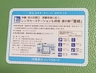 沖縄観光インフラカード、道の駅「豊崎」の再版です。裏面の番号は NO.009[Ver.2]2017.12 です。保護ラップに入れ厚紙で保護してミニレターで発送します。カードは4枚まで同梱できます。送料85円。不明な点はご質問ください。