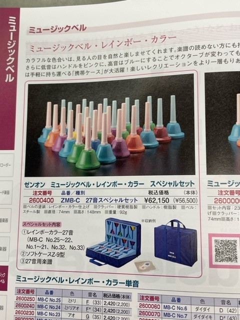 ゼンオンのミュージックベル ZMB-C レインボーカラー 27音スペシャルセットです。ダブって購入してしまいました。新品未開封、エアクッションで包み、140サイズで発送します。定価は6万2千円を5万チョイで購入しました。30%オフでスタートです。