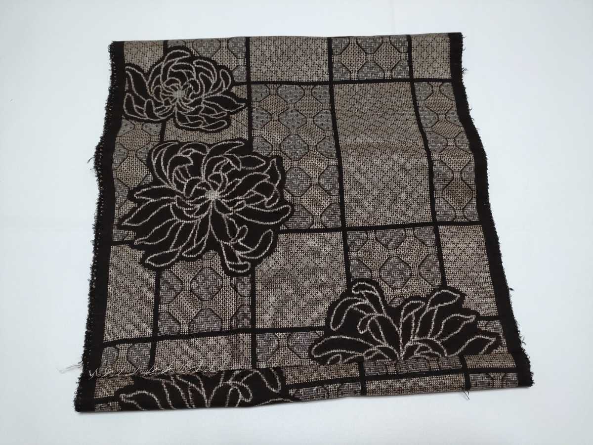 黒とグレーの格子柄に大輪の菊が織り込まれた上品な和モダンデザイン。