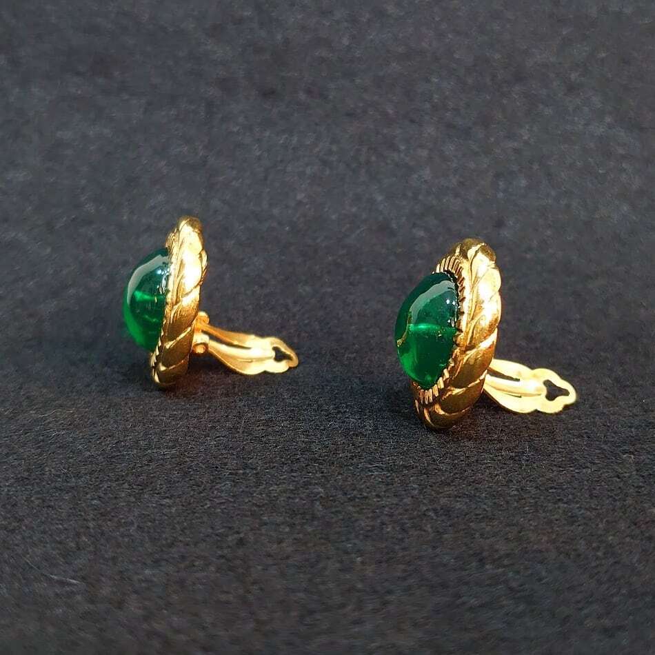 ラウンド型の台座にエメラルドグリーンのカラーストーンが施されたヴィンテージイヤリングです。