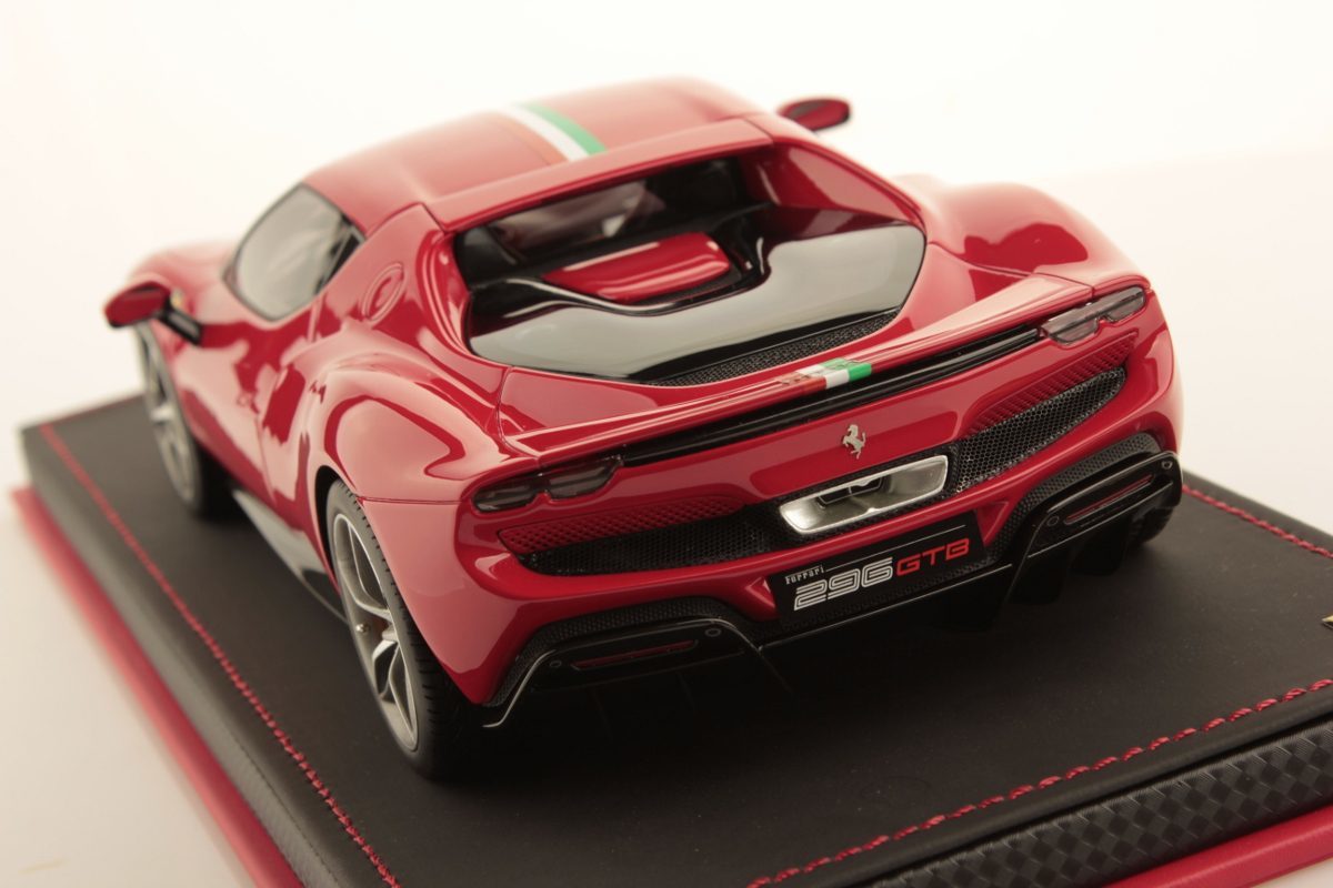 ★  今回お譲りするモデルカーは、出品写真に掲載中のモデルカーが現物となります。2021年6月に 初お目見えした 最新の ミッドシップ ( プラグイン ハイブリッド ) スーパー スポーツ の フェラーリ 296 GTB です。新型ターボエンジン + 強力な電気モーター + リチュウム イオン バッテリー = 830馬力 を発生しています。その事で動力性能の方も フェラーリ本拠地 ( フィオラノ サーキット ) では ( フェラーリ 488 ピスタ ) より 0.5秒速いラップを簡単に叩き出している 『 最新ミッドシップ スーパースポーツ 』 です!モデルのフロンド部 & ルーフ部分 & テール部 に イタリアストライプ が入った 『 世界で 1台 』 の瞬間完売 & 超入手困難モデルカー ” です!