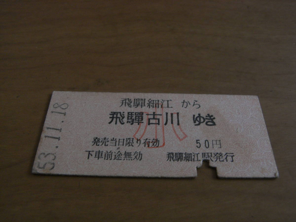 高山本線 飛騨細江から飛騨古川ゆき 小50円 昭和53年11月18日 飛騨細江駅発行 国鉄